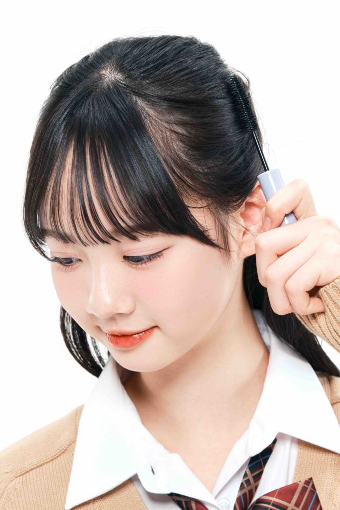 ②こめかみ辺りの髪に前髪スティックをあて、ボリュームを抑える。こうすることでイヤーマフがフィットするよ!