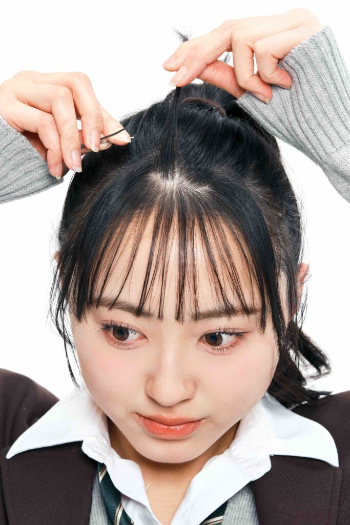 ②前髪の上半分の毛束を少し取って、ピンで留める。シースルー前髪で抜け感を出そう!