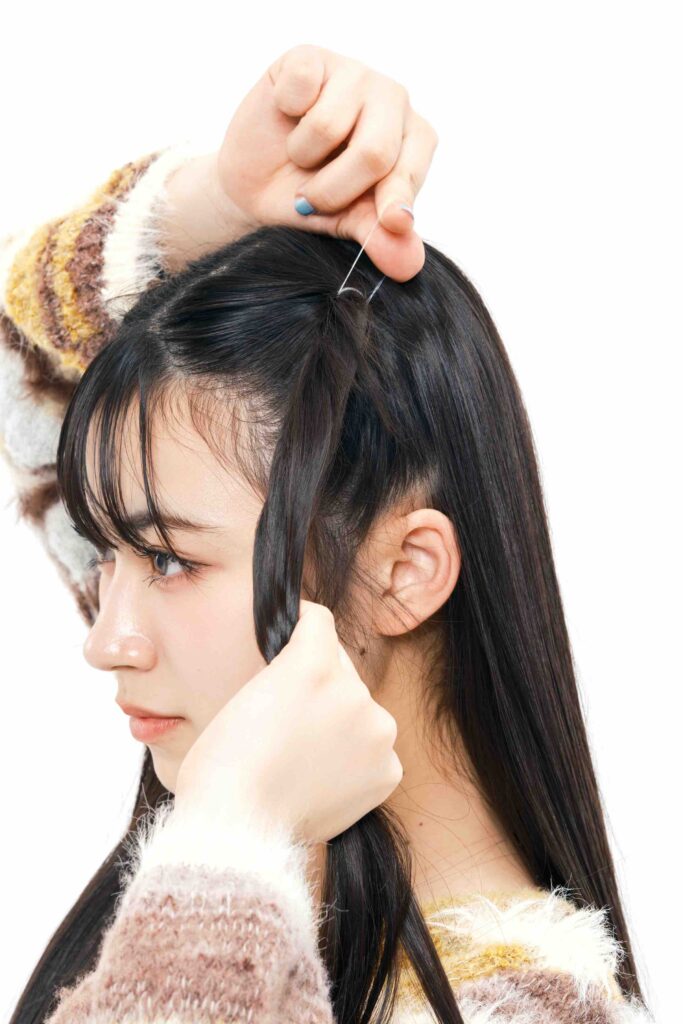 ①ハーフツインを、後ろではなく横に結ぶ!イヤーマフをつける位置とズラすことが重要。