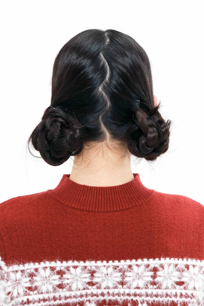 ②みつあみをくるくると巻きつけて、3カ所くらいピンで留める。ピンが難しかったら、ヘアゴムで結んでも◎!