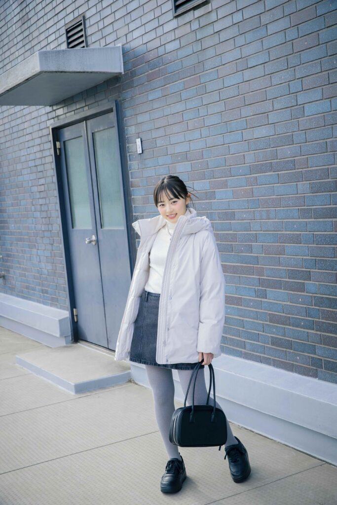 ユノ☆パデットステッチレスコート¥5990、ニット¥1990(一部店舗のみ販売)、スコート¥2490(オンラインストアのみ販売)、ネックレス¥590、バッグ¥2990、スニーカー¥2990/すべてGU
