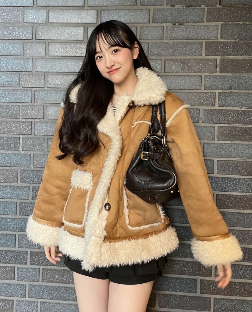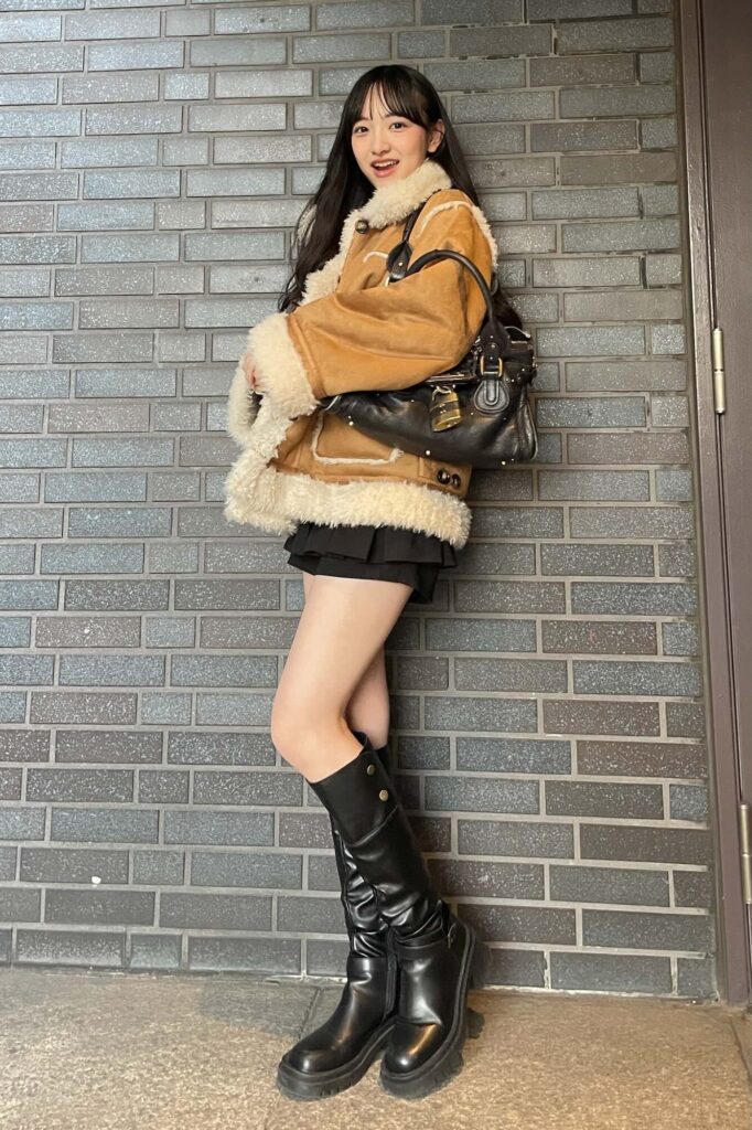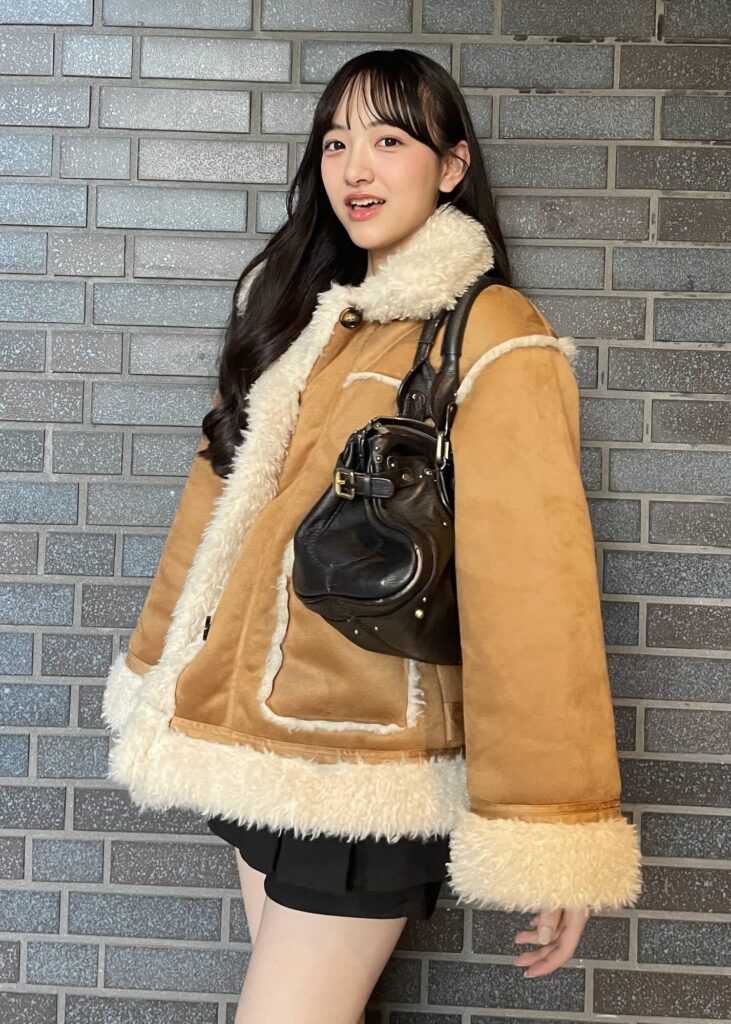 冬にぴったりなムートン風ジャケットは、キャメルカラーともこもこの素材感で大人かわいい雰囲気になる♪ 上にボリュームがある分、ミニスカートで脚をすっきり見せつつ、黒のロングブーツで全体を引き締めてスタイルアップを意識したよ。
