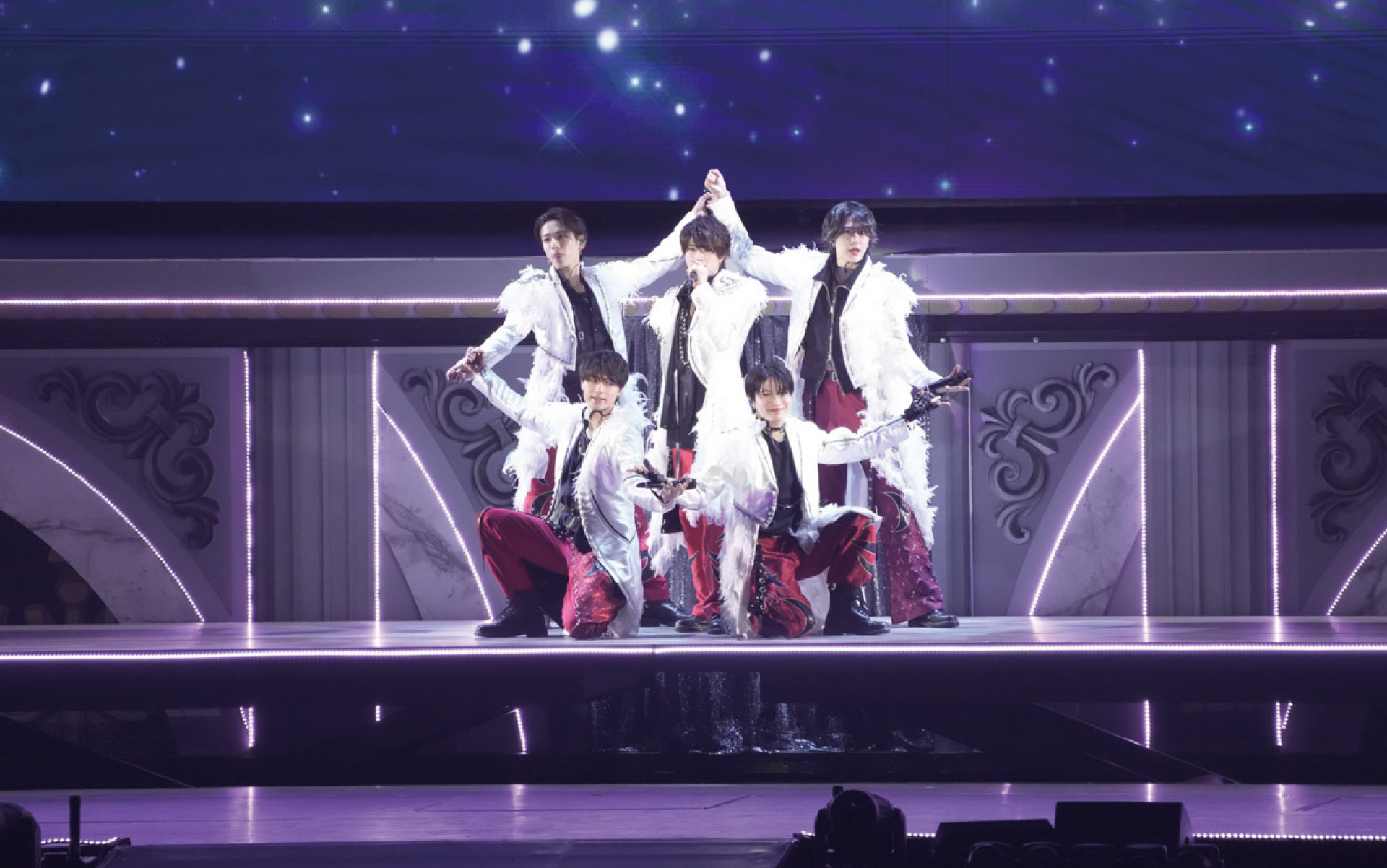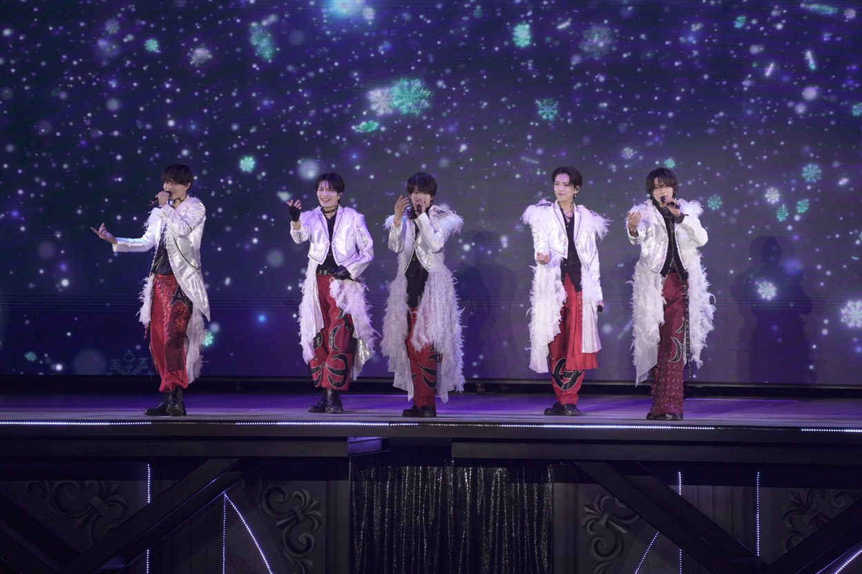 ACEesの見せ場は、ゴンドラで降臨して歌ったHey! Say! JUMPの『White Love』。まずは深田くんが「高い所から失礼します!改めまして僕たちがACEesです。ここからは僕たち5人のコーナーになります。一緒に楽しんでいきましょう」と挨拶。雪の結晶がスクリーンに舞う幻想的な中で、那須くんがトップバッターで歌唱。衣裳は、ファーのような羽根が付いた白アウターに黒シャツ、赤パンツで華やか。那須くんは首元の黒チョーカーと皮のグローブがアクセントで他のメンバーよりちょっぴりワイルドな雰囲気。浮所くんは黒×ゴールドのロングの二連ネックレスと第2ボタンまで外した黒シャツの胸もとがセクシーだったよ。