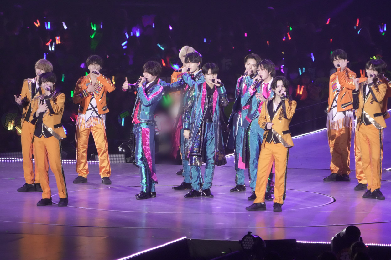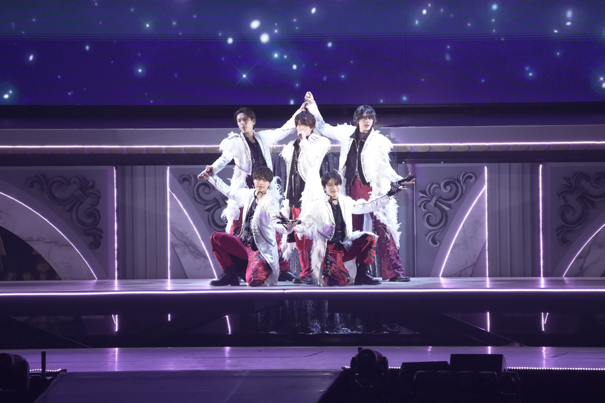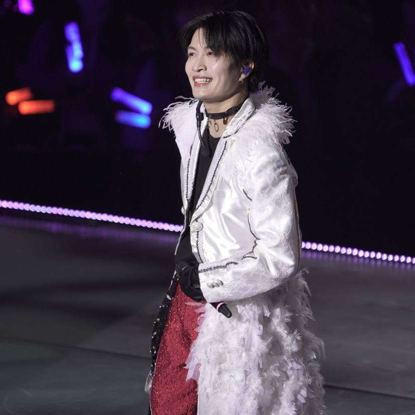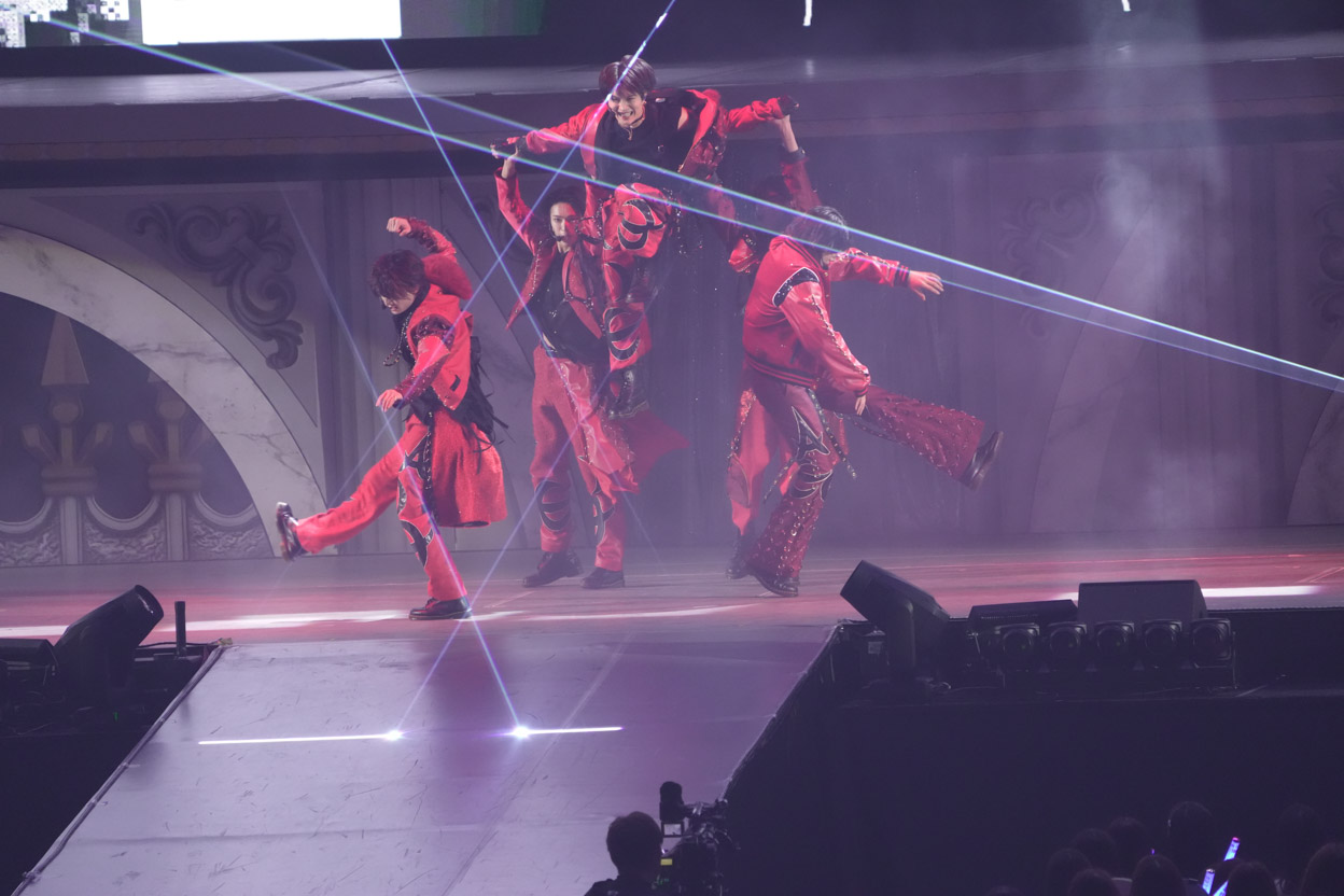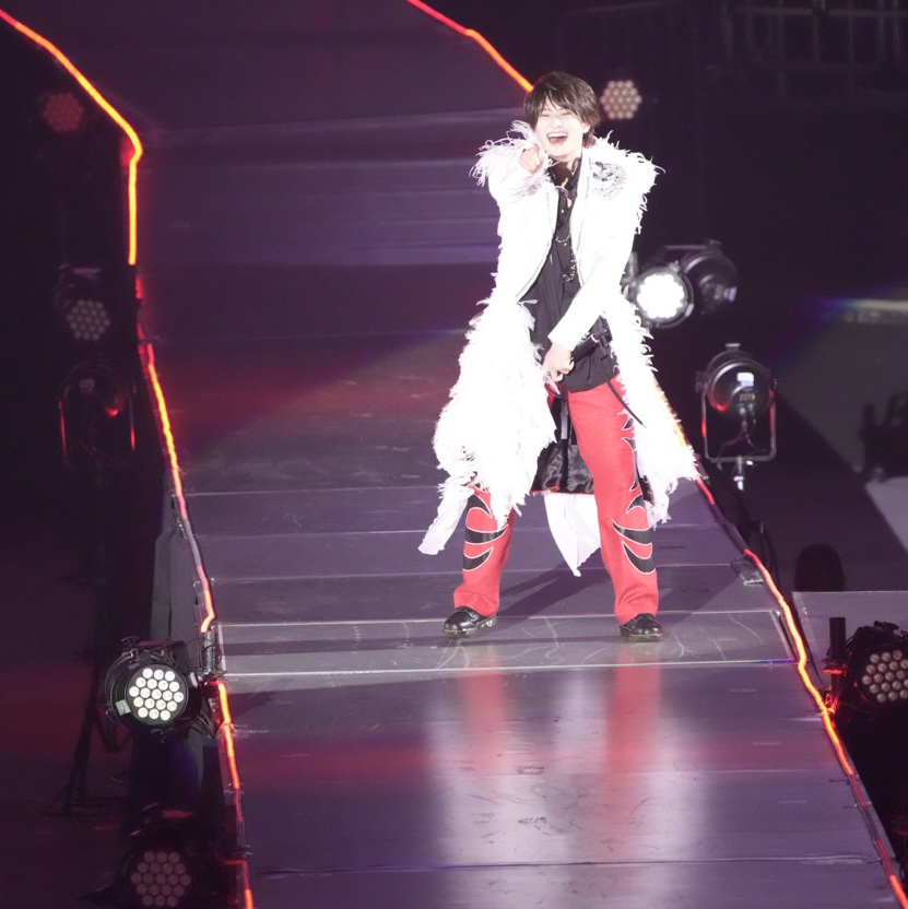 総勢77名のジュニアが共演するステージで堂々、トップバッターを飾ったのがACEes!! 浮所くんの「イェイ、イェイ、スタフェス始まったぞ!調子はどうなんだ、横アリ!俺たち5人がACEesだ!!」という叫び声で、嵐の『ワイルドアットハート』から幕開け♪ファーが付いた白衣裳で踊る姿は、まぶしすぎるほどキラキラオーラ全開!那須くんが作間くんと肩を寄せ合って踊ったり、浮所くんが深田くんと見つめ合ったり……。仲良しさが伝わる完璧パフォーマンスにクギ付けに!! 作間くんの「最後までよろしく!」の声で、関西ジュニアにバトンタッチしたのでした。