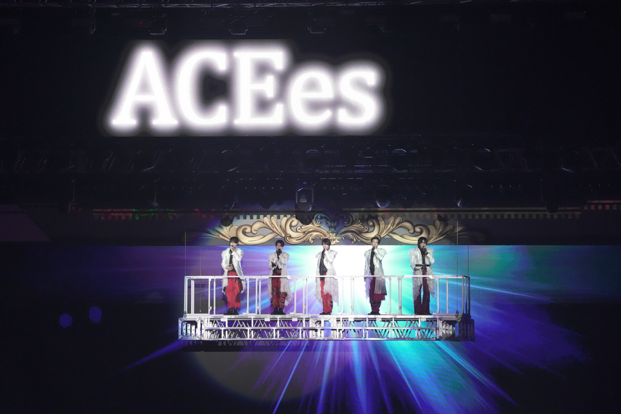 ラスト浮所くんをセンターに5人で星を描くキメポーズをして、嵐の『言葉より大切なもの』へ。龍我くんがトップバッターで歌った後、那須くんが「横アリ楽しんでるかい?もっともっと!楽しんでるかい!俺たち5人がもっと楽しませてやるよ、よろしく!!」と会場をコール&レスポンスする場面も!中盤、「上のほう」と会場をあおっていた浮所くんが「いくぞー!!」と叫ぶと、バックステージまで花道をダッシュで駆け抜ける5人。タイムを測定しているのかと思うほど、ガチすぎる全力疾走ぶりから彼らのステージへの熱い想いがひしひしと伝わってきたのでした!曲の合間には作間くんが「僕たち5人、正直不安になること、迷うことたくさんあります。ただこうして皆さんが熱を届けてくれるから、僕たち前を向けます。今のうちに推しておいて下さい。ACEesは、必ずビッグスターになります!!」と力強く宣言し、沸く会場。櫻井翔くんを敬愛する那須くんのラップも力強くパフォーマンスを盛り上げる姿は輝きまくり!ラストは「最高です、もういっちょかまします!!」と次の曲へ。