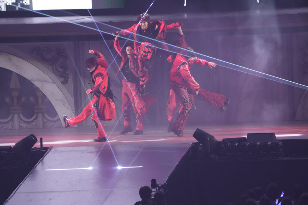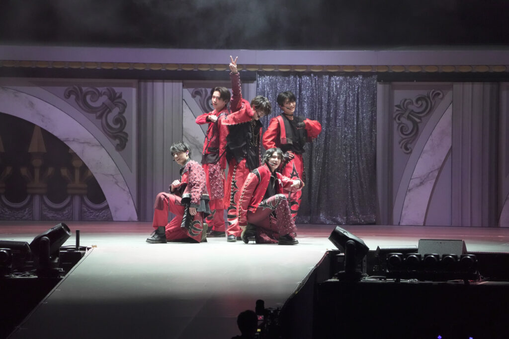 Interで赤い衣裳にチェンジした5人。スパークラーの炎が激しくガンガン吹き上がる中で披露したのは、ACEesのオリジナル曲『Acing out』。この曲は、笑顔を封印して挑むハードなダンスナンバー。作間くんが裏側を撮影した動画も公開されている通り、海外でダンスレッスン修行をするなど、この1年でパワーアップしたダンス力をフル発揮。俺らがNo.1と歌う熱い歌詞を、胸をはって歌う5人の力強く男っぽいダンスに圧倒される会場。ACEesは、踊れるグループ、そしてNo.1になれるアイドルということを堂々証明していたよ!