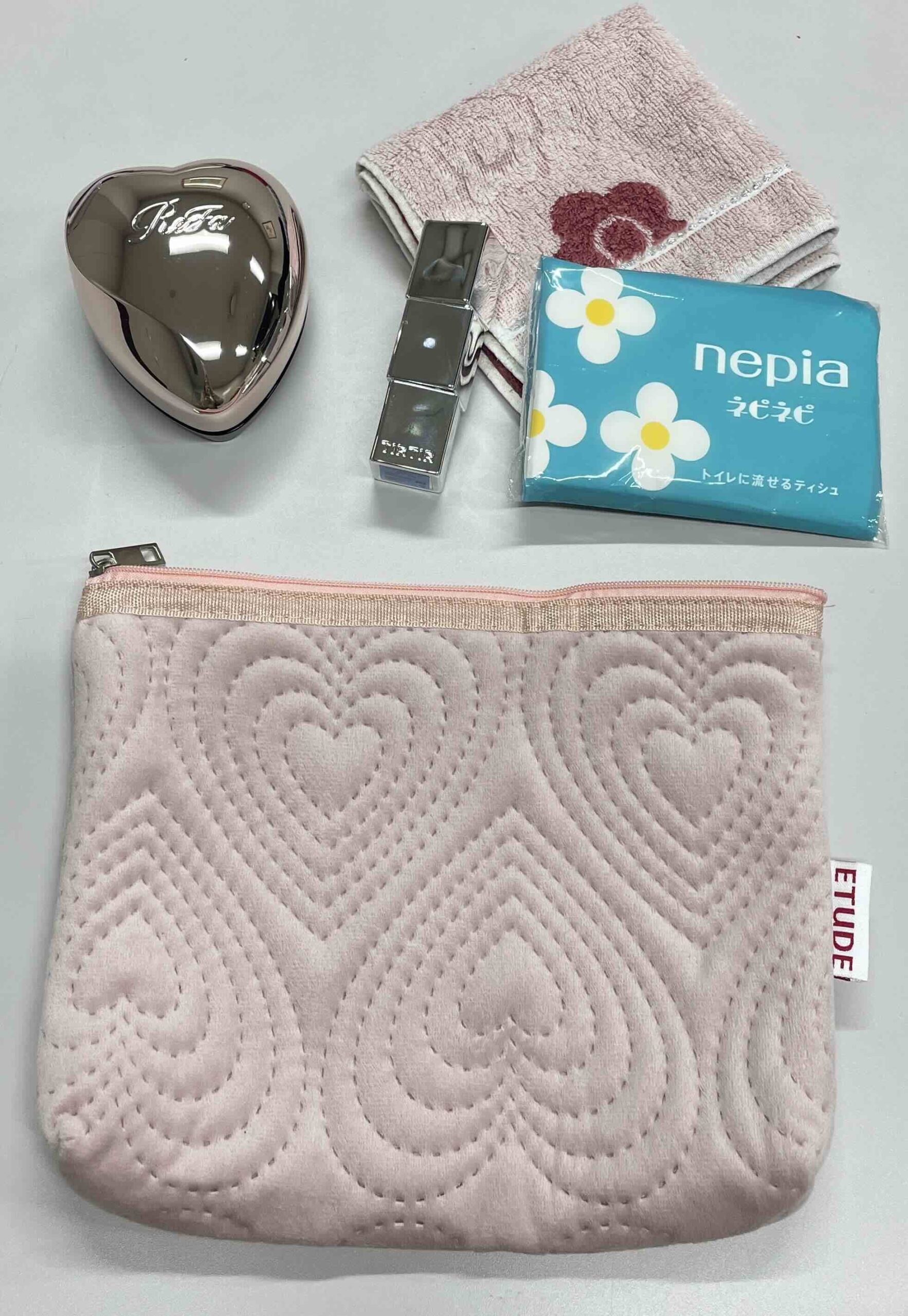 「ニコラ付録のキルティングポーチは大容量でとっても使いやすい!必要最低限の身だしなみグッズを入れているよ♡」