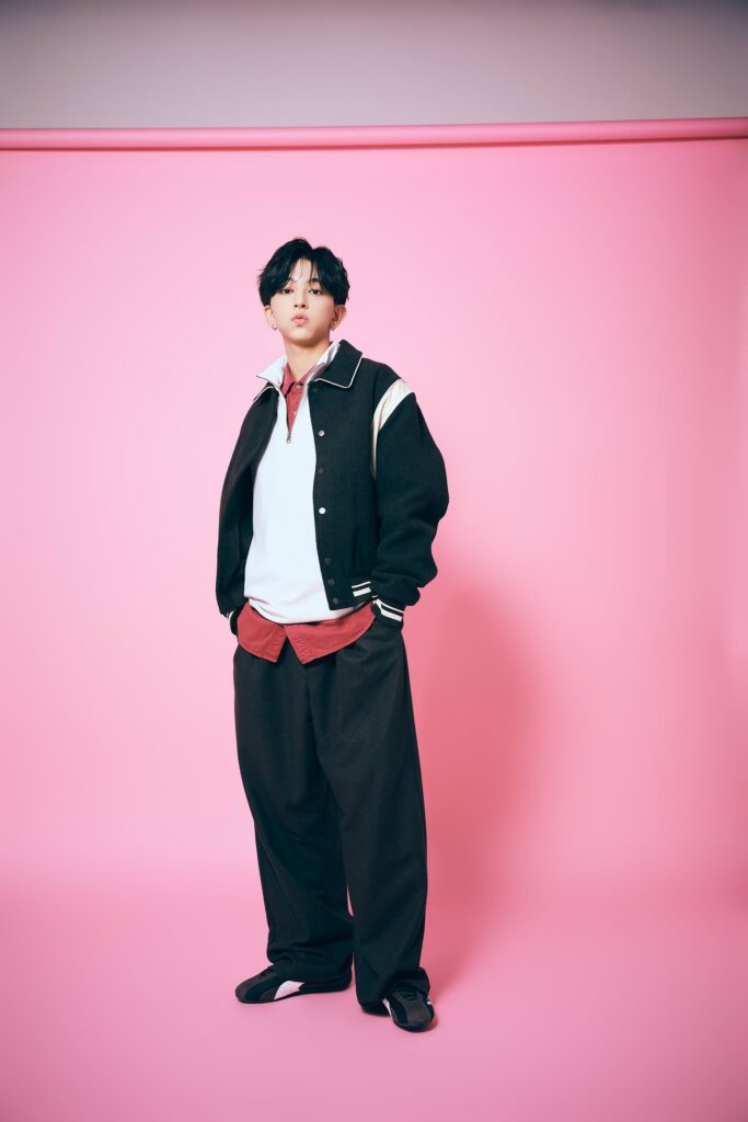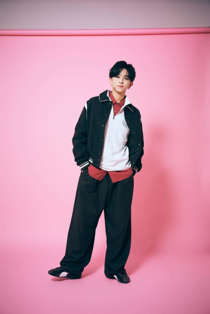 リョウスケ☆ブラウンスタジャン¥13590、ブラウンパンツ¥15990/ZARA 白スエット¥8990、エンジシャツ¥9990/Gap ゴールドイヤリング¥790/ルピス ブラウンスニーカー¥17600/プーマ