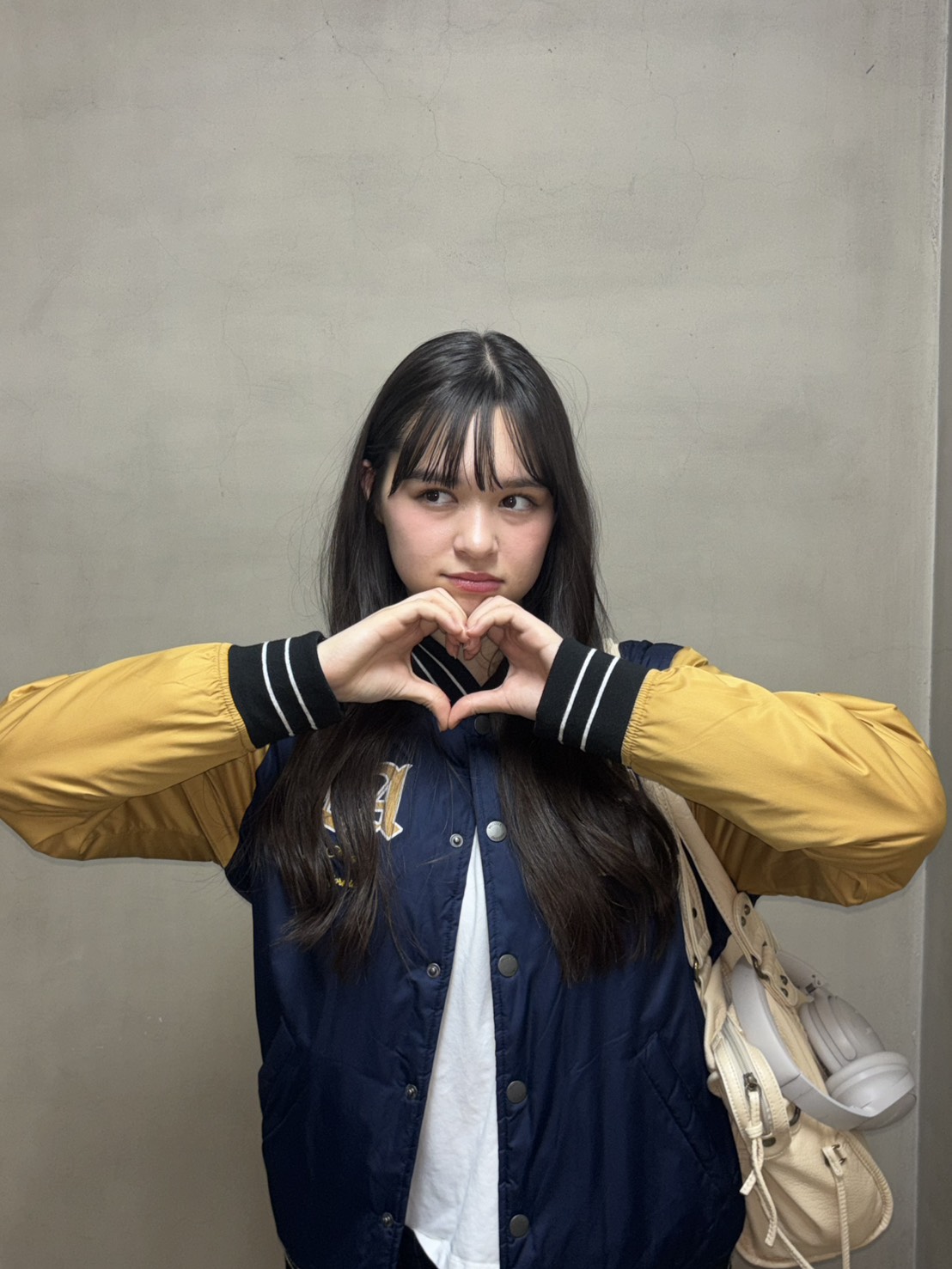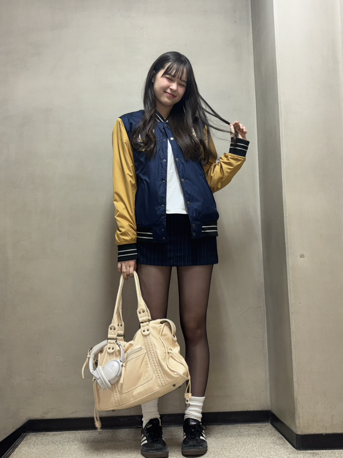 イエローとネイビーの映えるスタジャンに黒のタイトミニを合わせれば海外ガールっぽさもあるカジュアルコーデに!タイツに靴下を重ねることで冬でもあったかくミニスカを着こなせるよ♪靴下をくしゅっとさせてルーズ感を出すのがポイント。