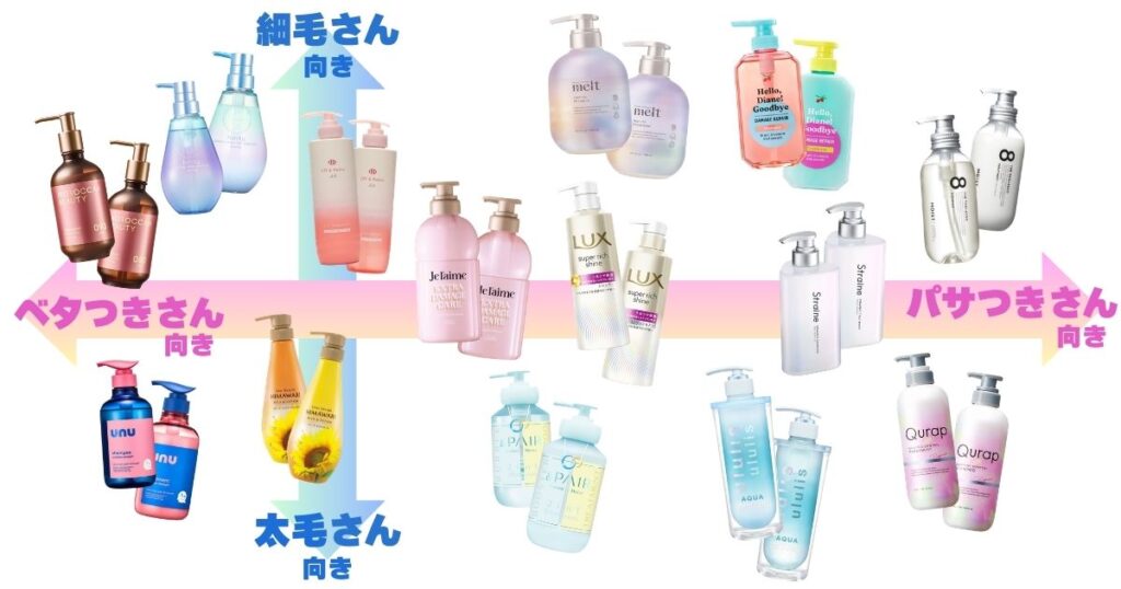 髪質を細毛さん、太毛さん、パサつき毛さん、ベタつき毛さんの4軸に分けて、それぞれの度合いに合うシャントリを一覧でまとめたよ。自分の髪質に合わないものを使うと、かえって逆効果になるから注意。さっそくそれぞれの商品の特徴をチェック!