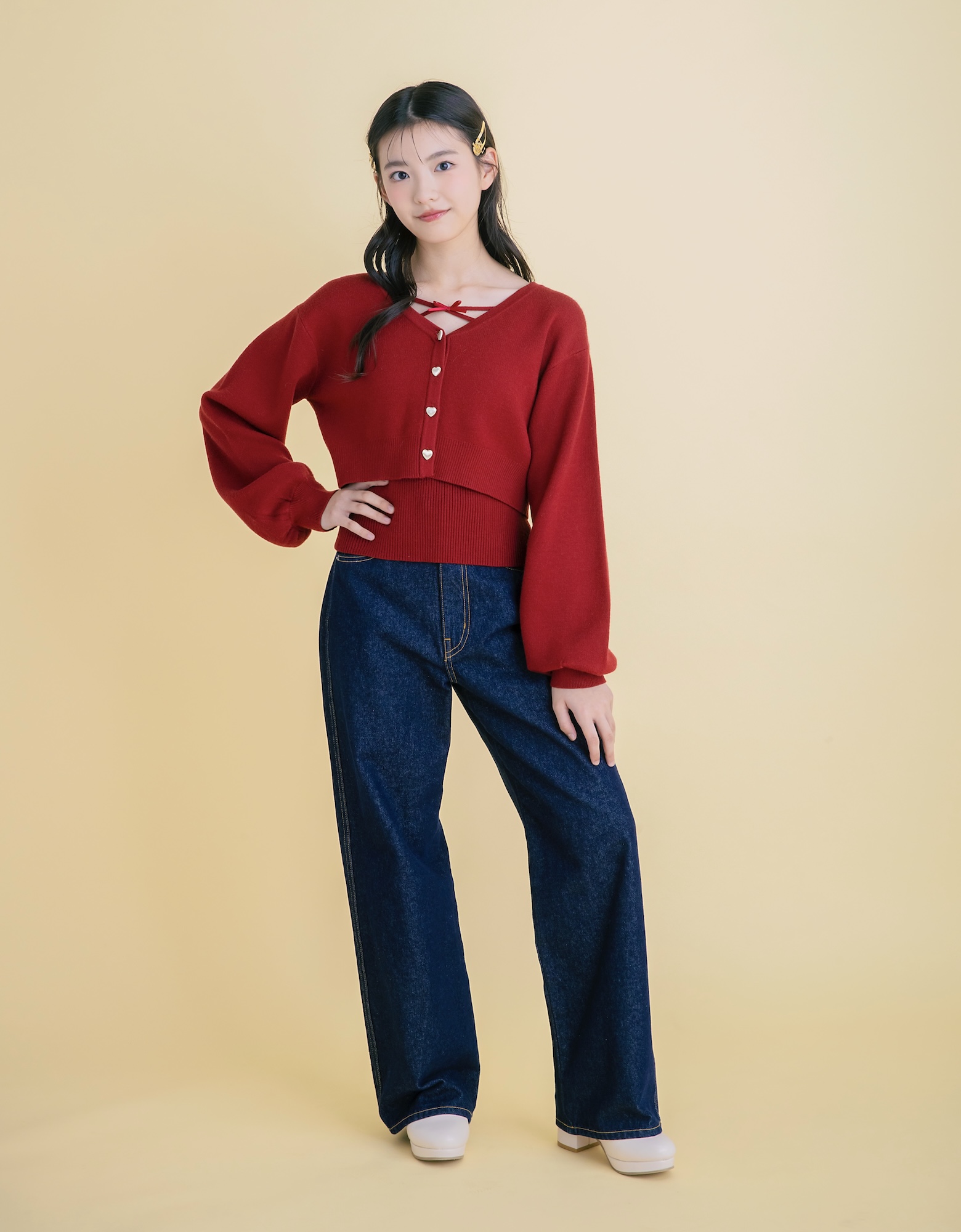 ニットドッキングミニワンピ¥11000/マジェスティックレゴン デニムパンツ¥3299、バッグ¥3299/ともにWEGO ヘアピンセット¥330/パリスキッズ 原宿本店 ローファー¥4389/SPINNS