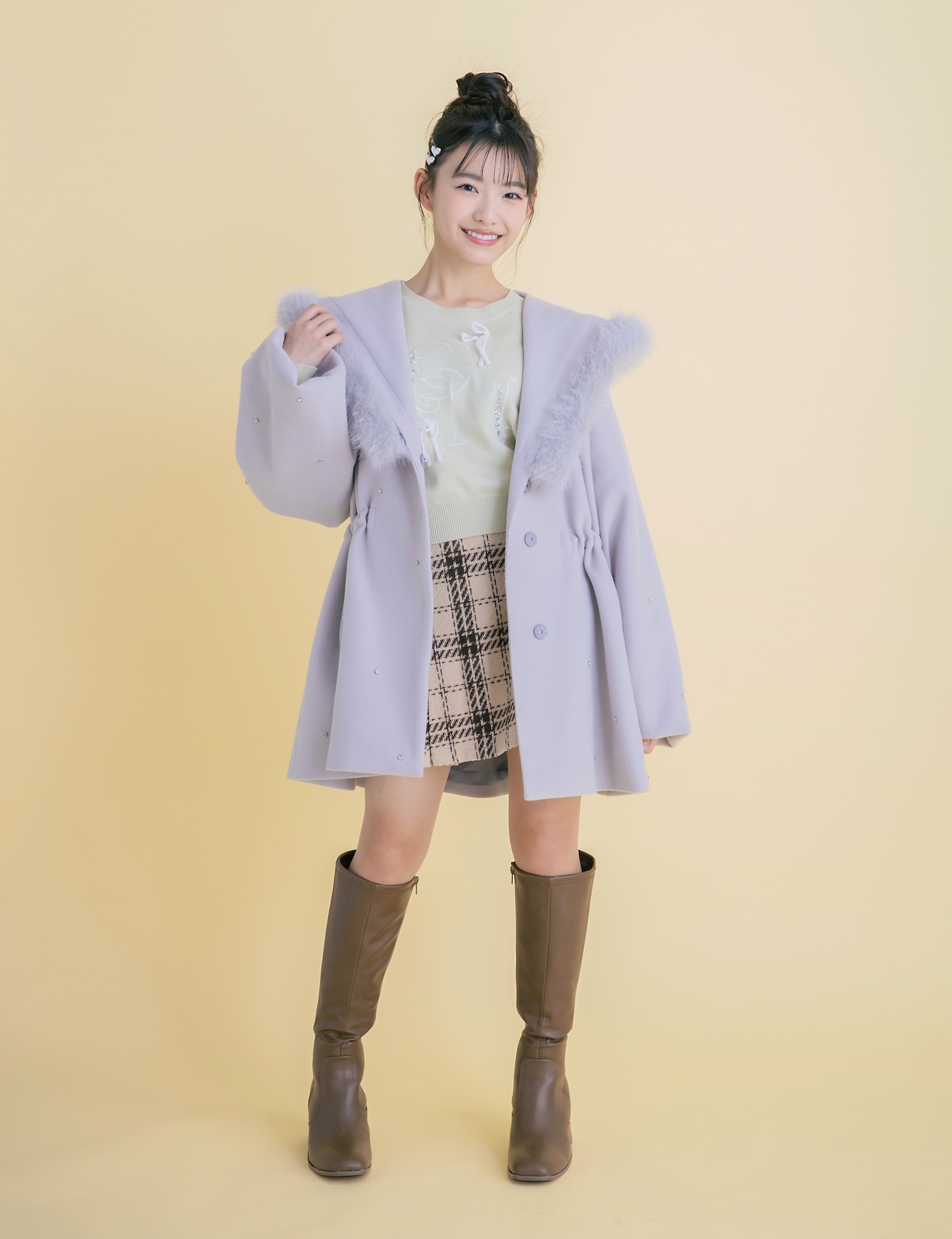 ★アウターは、ロング丈よりも腰位置が高く見えるショート丈が得意。上半身が華奢だから、ボリュームのあるボア素材を着ても、まとまりがよく見える&視線を上に持っていける!