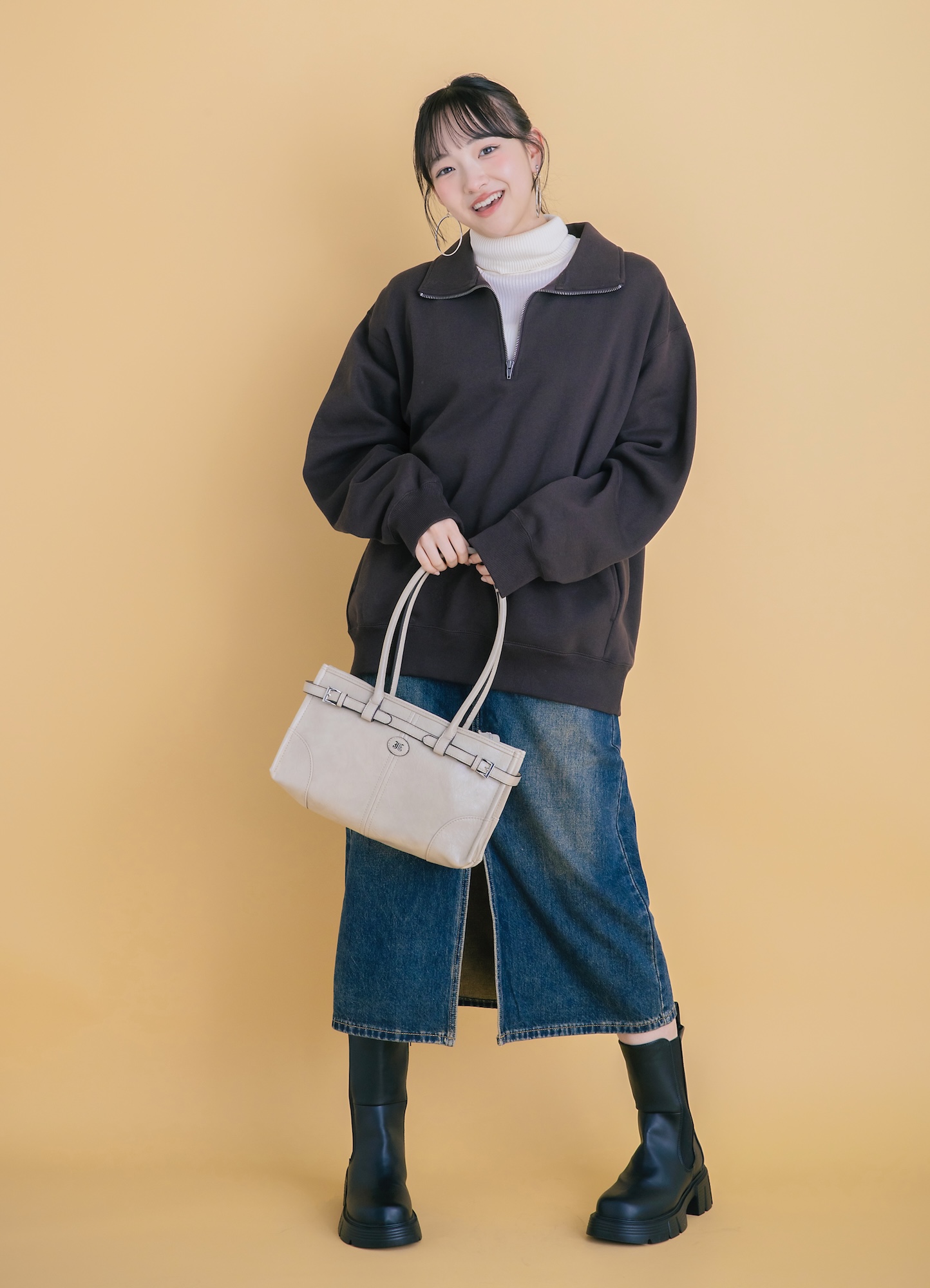 ★大きすぎるバッグよりも曲線的・コンパクトなバッグを合わせて全体的な統一感を意識。