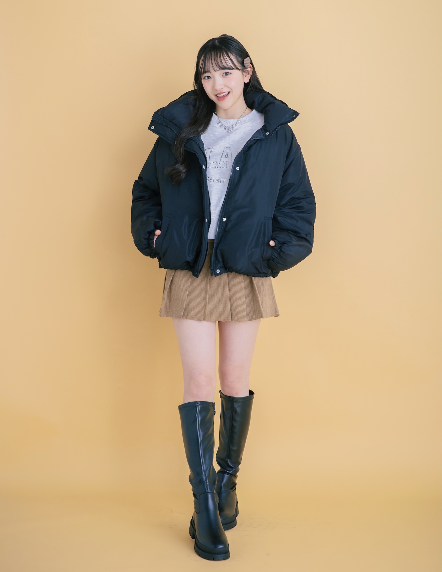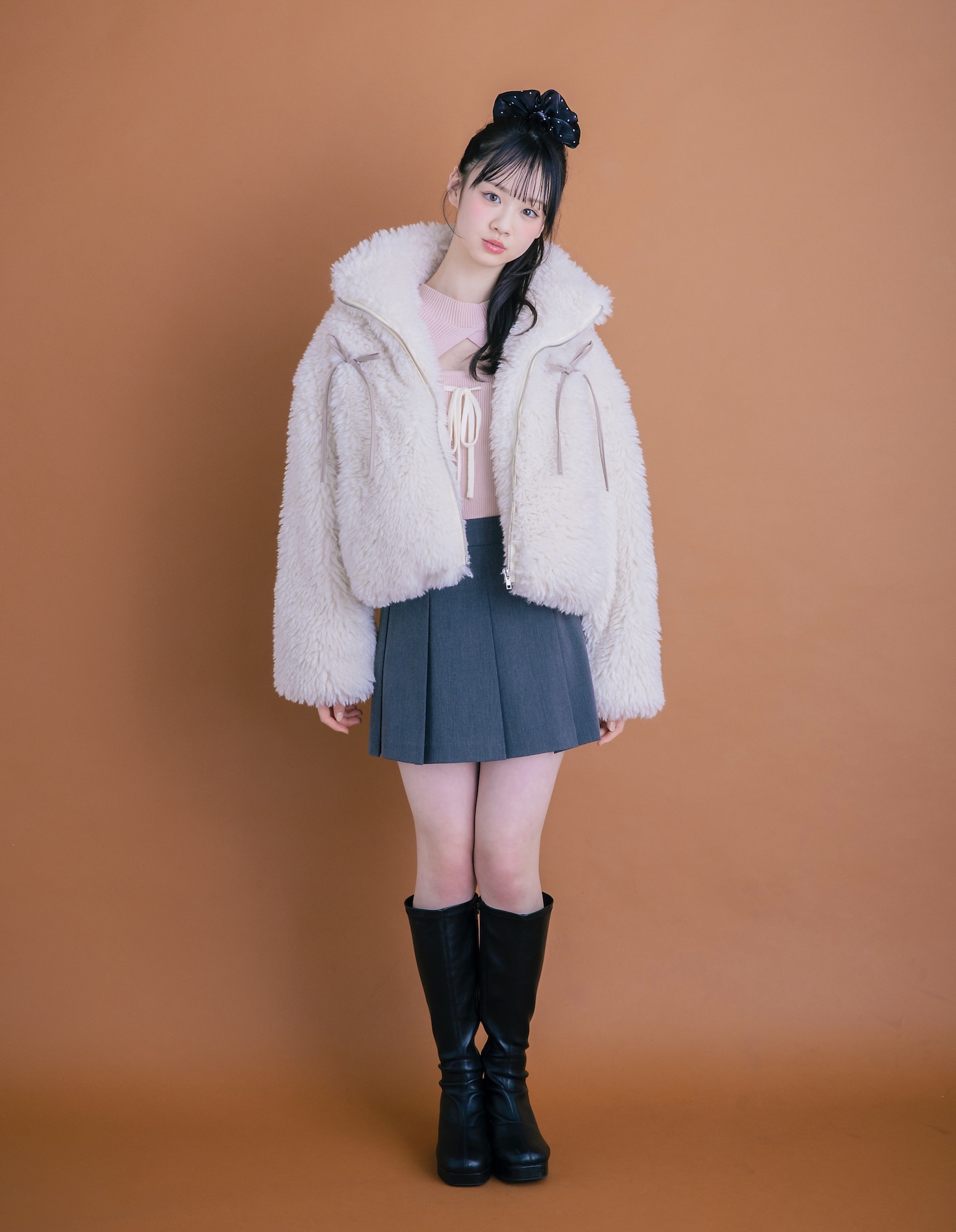 ボアショート丈ジャケット¥3799/グレイル ニット¥6380、ロングブーツ¥12100/ともにマジェスティックレゴン スカート¥2990/ユニクロ シュシュ¥550/ラティス