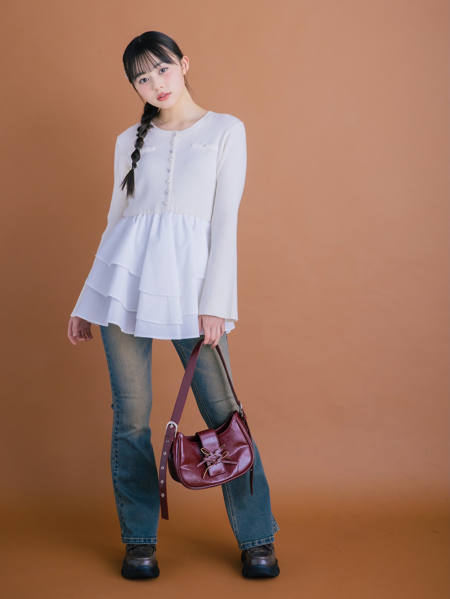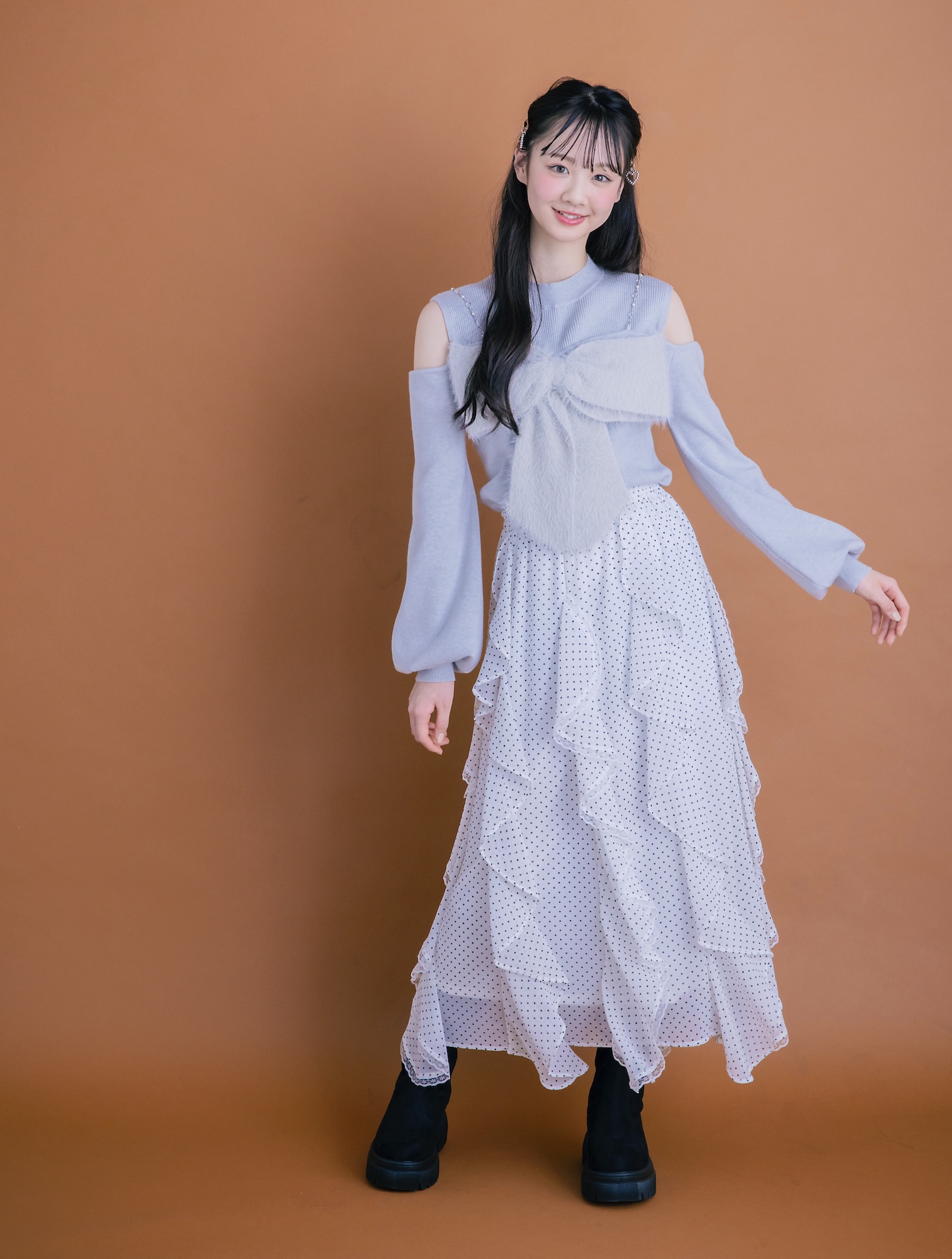 ★大きなシャギーリボンや肩あきデザインなどで、上半身をデコラティブにして視線を上に!トップスの装飾は多めが似合うよ♡