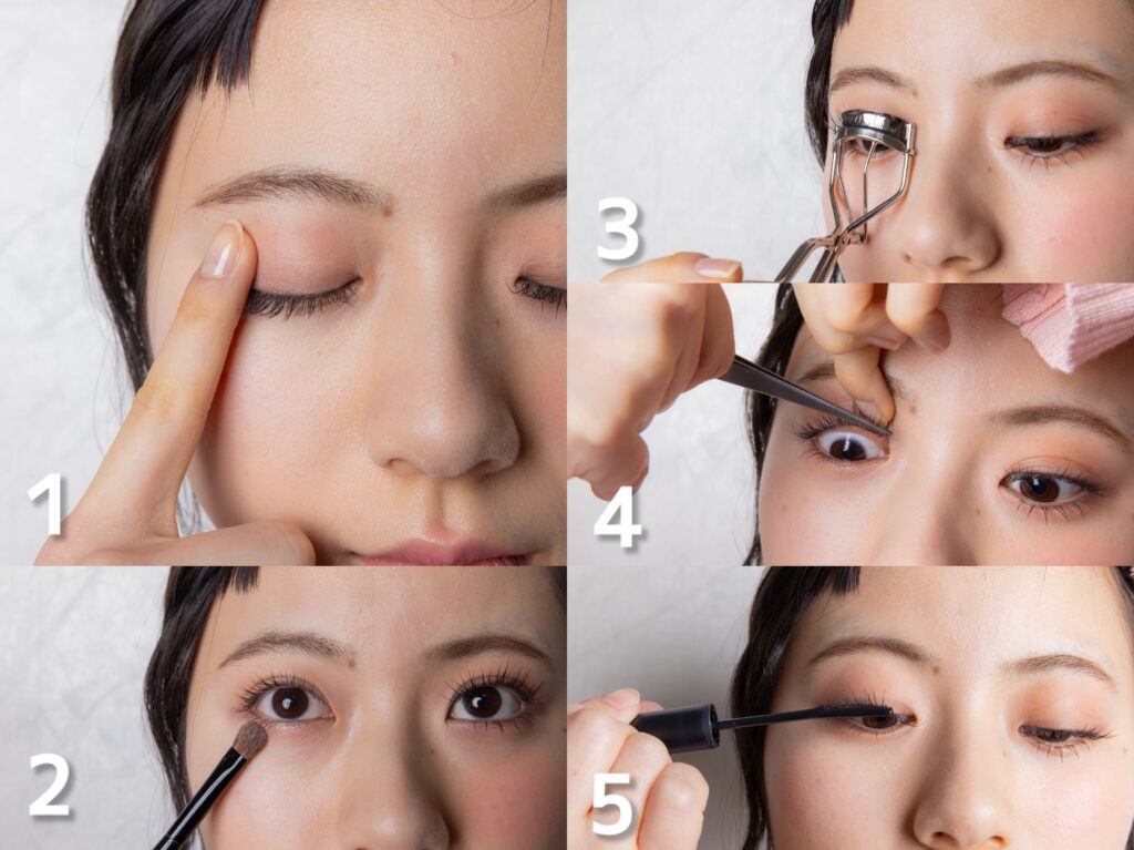 5.マスカラは、スッと長さを出す意識で。下まつ毛はピンセットで束感をつくる。