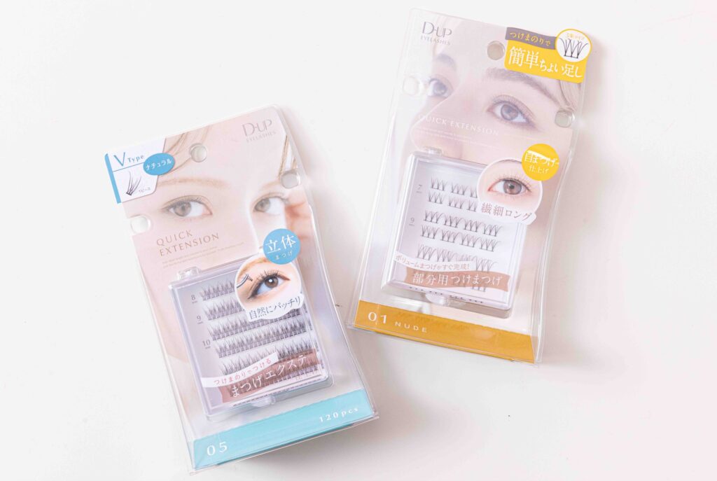 4.多幸感に必須なまつ毛のボリュームを出すため、つけまつ毛をつける。指でまぶたを上げるとつけやすい!めの幅に合わせて部分つけまを4〜5個つけてね。部分つけまは、粘膜に触れないギリギリのところとまつ毛のあいだにつけるのがコツ。つけまものりも、ディーアップでそろうよ。