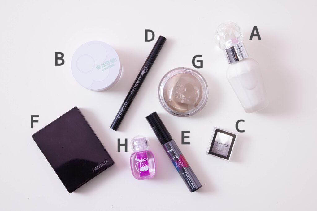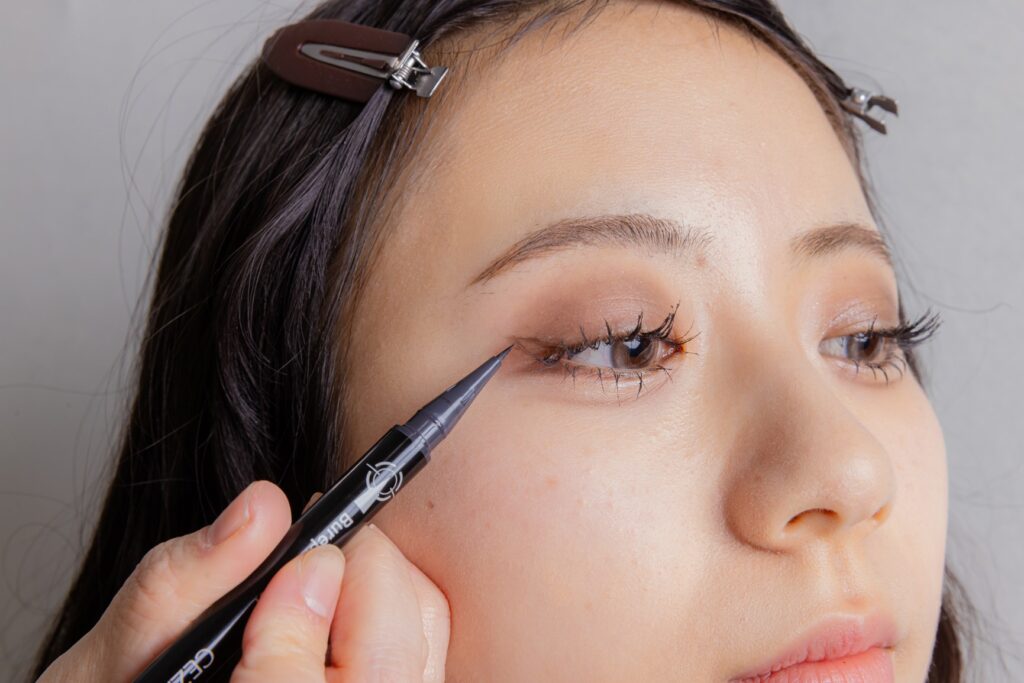 4.Dの黒リキッドライナーで、目尻に三角を作る。中を埋めて濃いめのキャットラインに。涙袋はDのライナーで影を描き、Fの一番明るいカラーでぷっくり感を出す。
