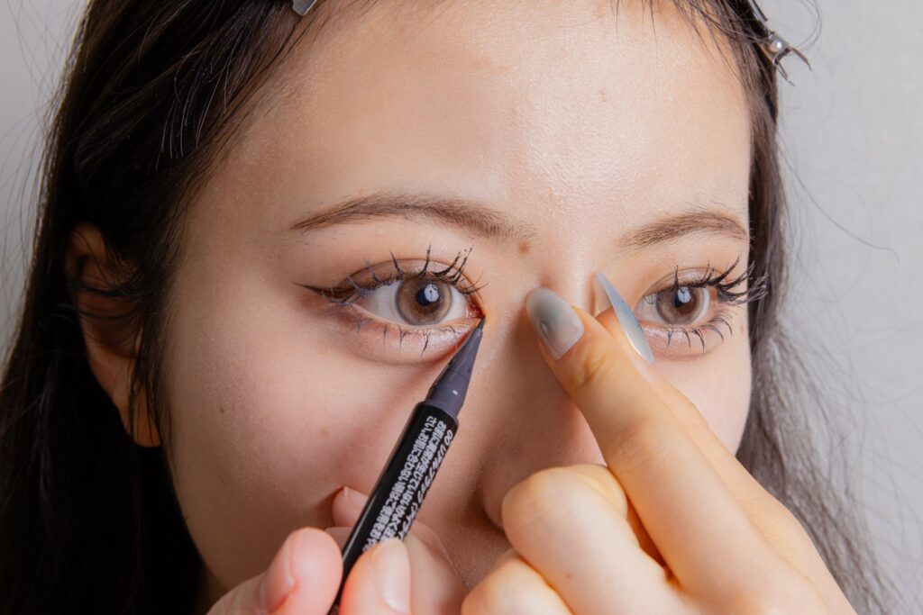 5.Dのライナーで目頭を少しはみ出すくらいの切開ラインを引く。こうすることで目の大きさが倍に!切開ラインを引くときは鼻筋を引っ張ると描きやすいよ。