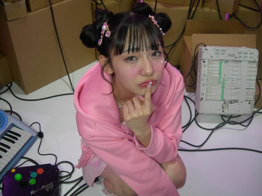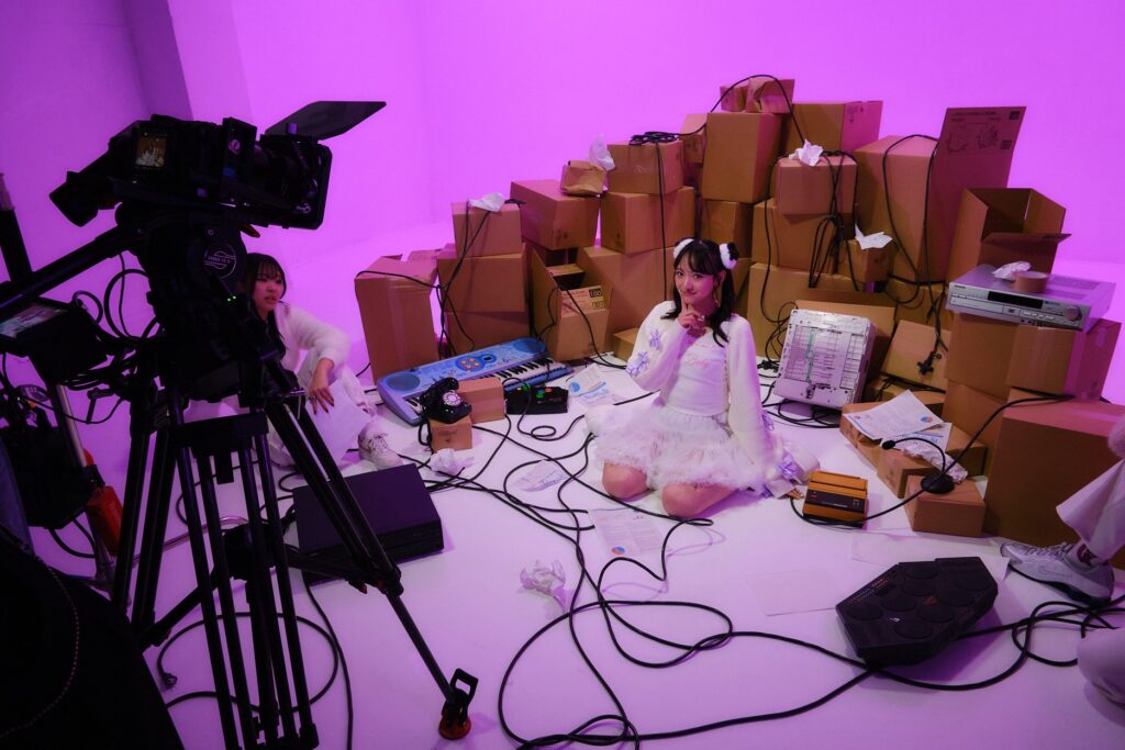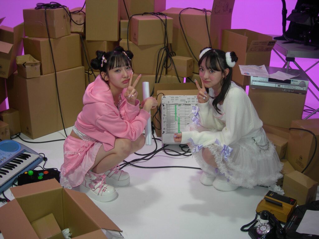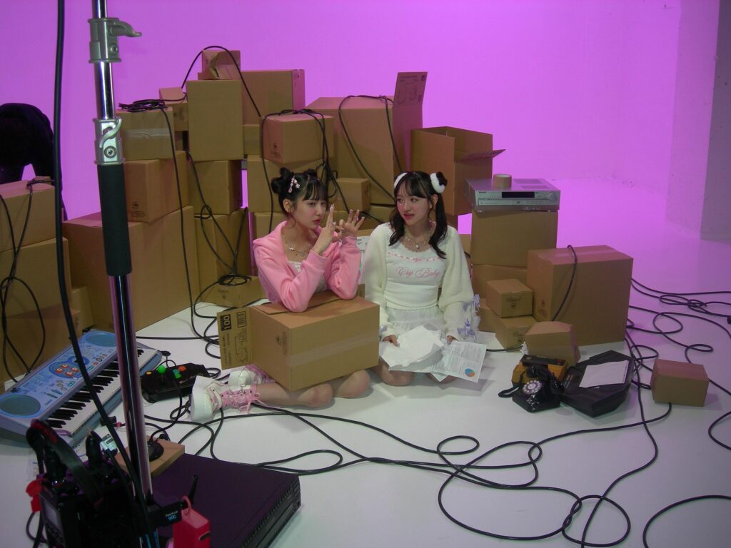 最後の撮影は、ジャケットビジュアルにもなっているメンバーカラー衣装での撮影。たくさんの段ボールや機材の中から、ロボットの説明書を見つけるという大事なシーン。出来上がったセットをいち早く見つけたリリは「すごい!エモくてかわいい〜!ここから説明書を見つけるんですか?」と嬉しそう。早速真ん中に座ってポージング♩最後のシーンということで、緊張もほぐれリラックスした様子。しかし最後までダンス練習を怠らないのがリコリリ!難しいステップが続く最後のダンスも難なく終え、和やかに撮影終了★
