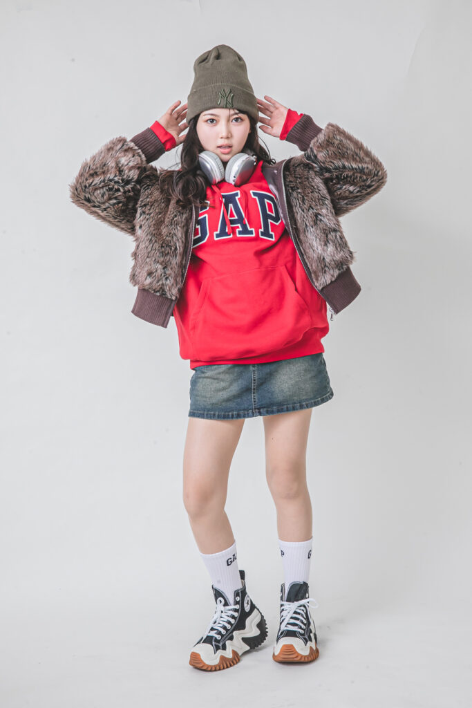 今シーズンのトレンドカラーの赤でハッピーでカジュアルな一面アピ! 厚底コンバースや帽子まわりも個性強めでいきますねー!
