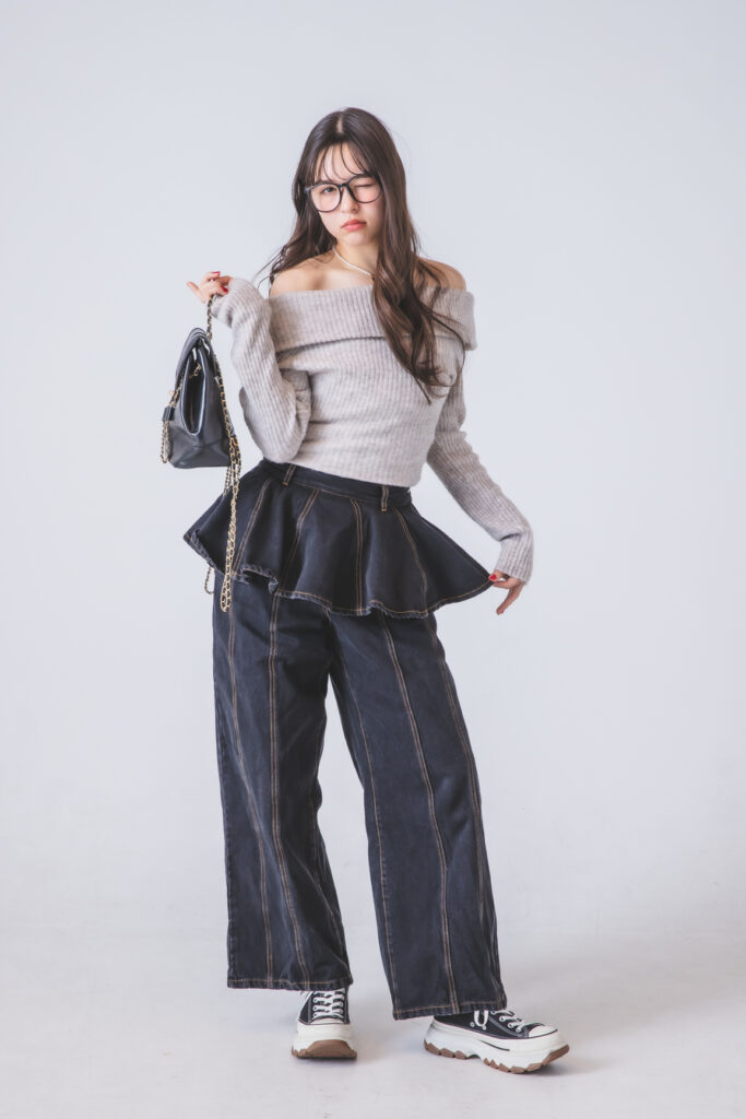 フリルつきのパンツが主役! 下がボリューミーだから上はタイトに、オフショルで抜け感を。靴がスニーカーにしたのもこなれポイント。