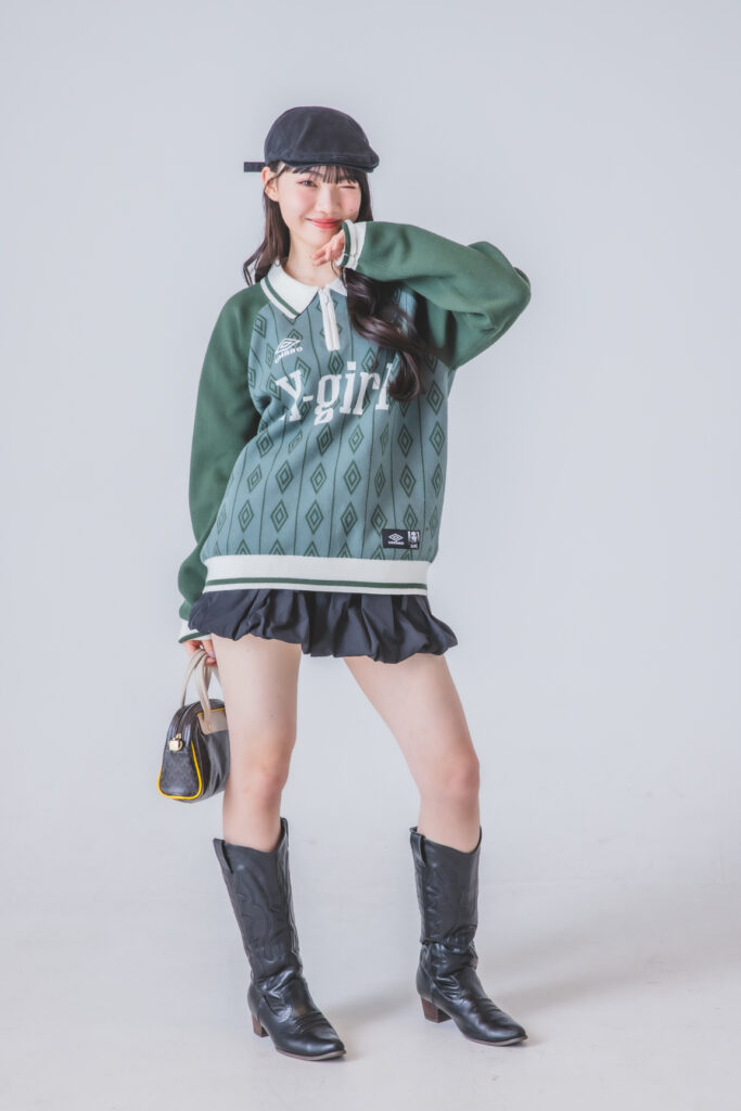 トップスのくすんだグリーンに一目ボレ。バルーンミニをちらっと見せて、キャスケットとウエスタンブーツでレトロ感をさらにプラス。