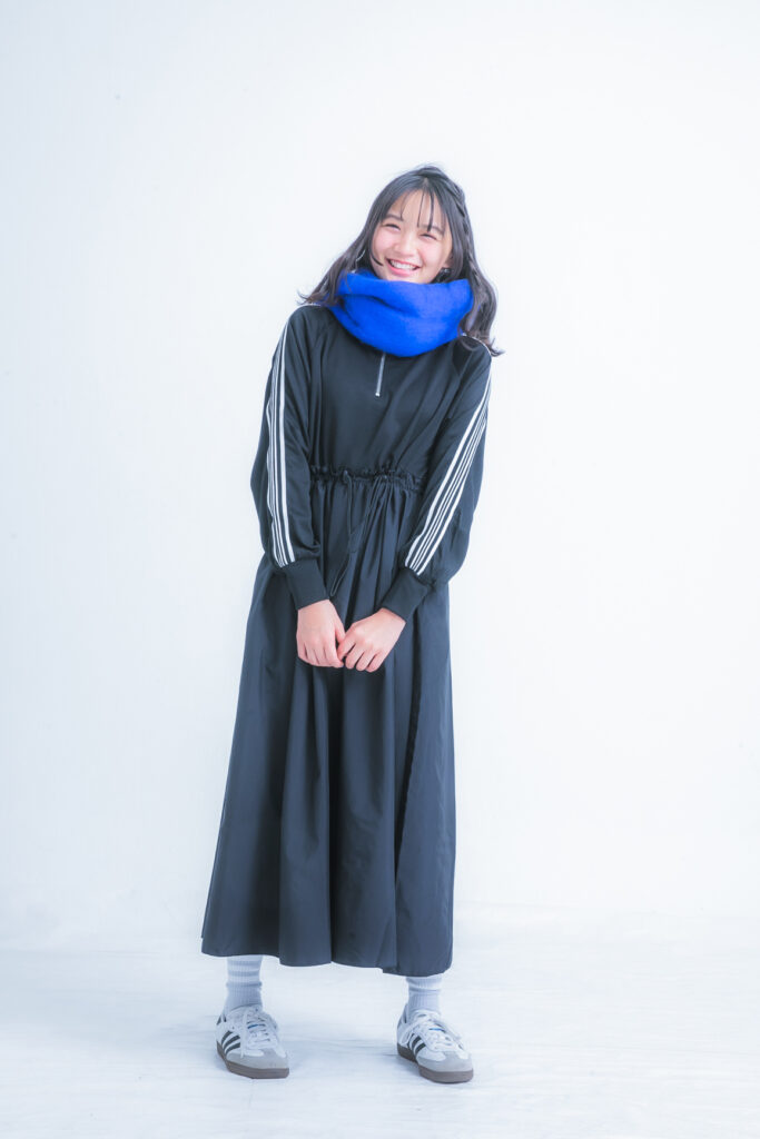 黒のスポみのある大人ワンピは、青マフラーで鮮烈な差し色を! ブーツ合わせも大人っぽいけど、アディダスのサンバで足もと軽く♪