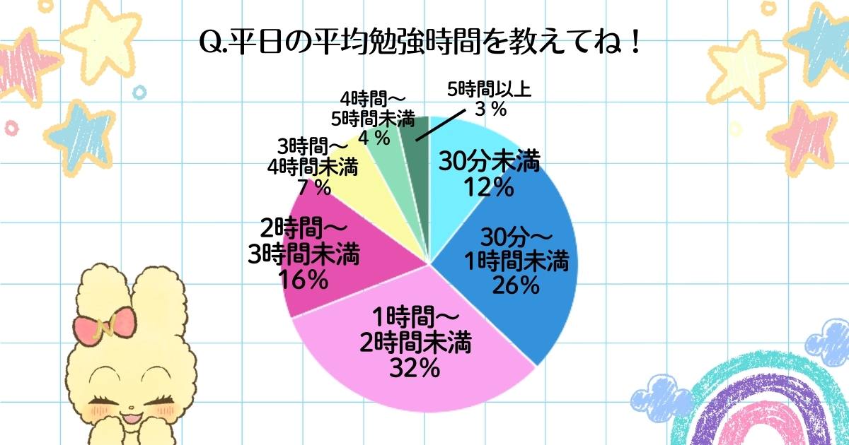 中高生の平均スマホ利用時間は1~3時間未満が多数派。学校ではスマホNGの学校も多く、通学中や帰宅後に息抜きとして利用する場合が多かったよ。SNSをチェックしたり、推しを眺めているとついつい使いすぎてしまう…!との声も。