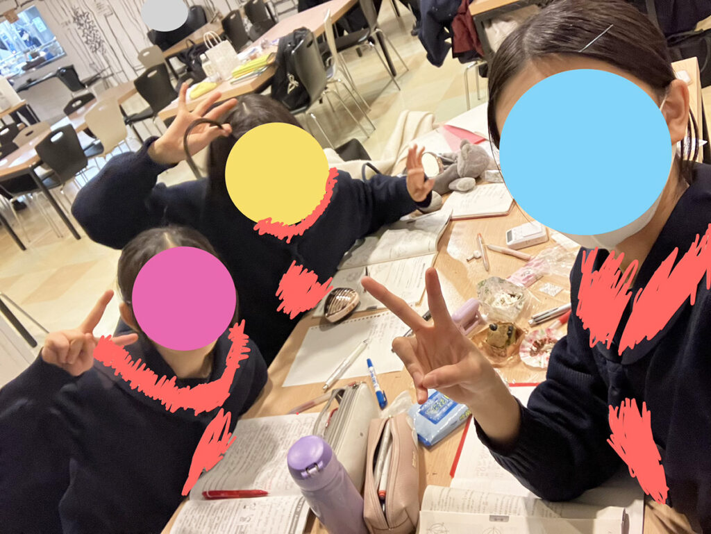 勉強スペースで友達と勉強した時の写真!ちょうどバレンタインだったからお菓子食べててゴミが散らかってる、、(笑) お菓子もめちゃ食べてたけど、勉強も捗りました!(中2・あゆ)