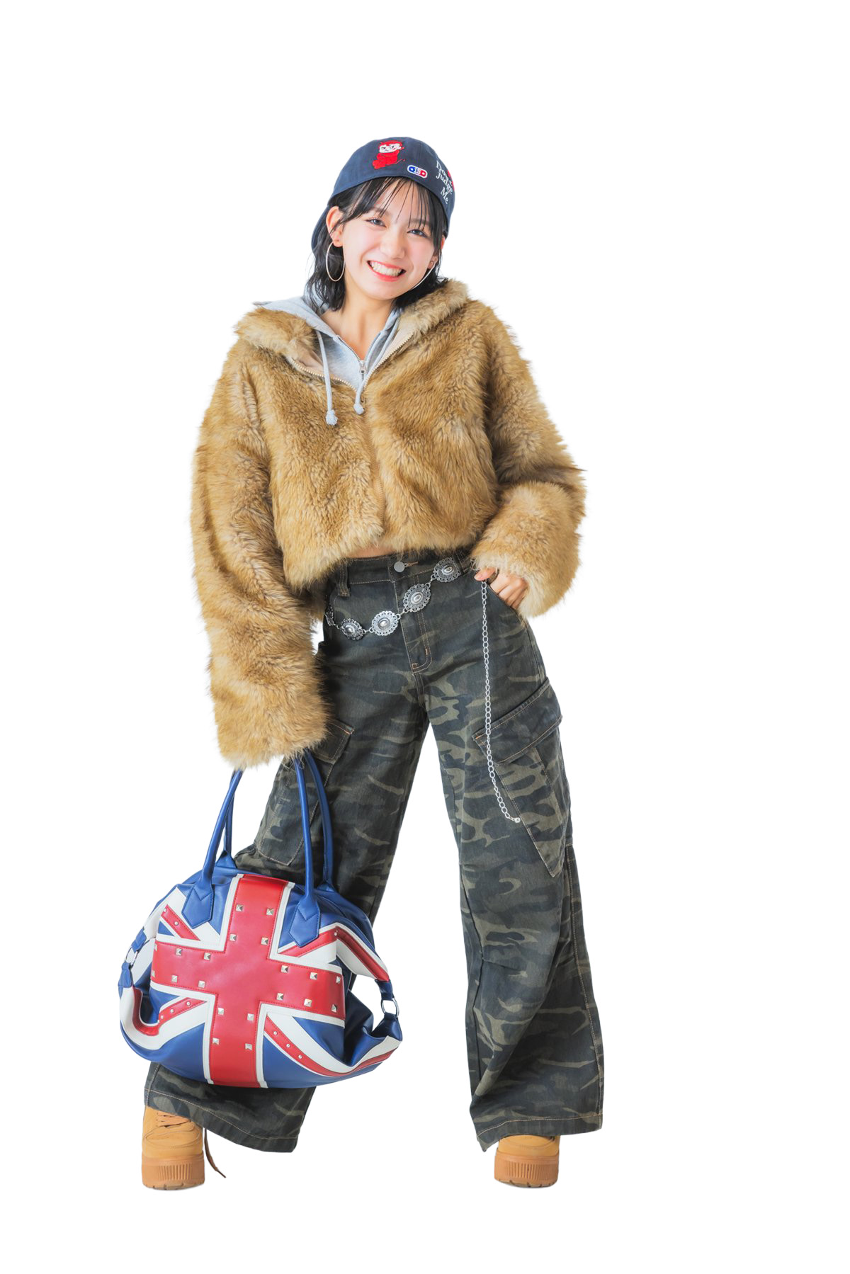 迷彩柄と国旗バッグってトレンドを入れつつ、キャップを逆にかぶってヤンかわムーブ!個性バッチバチの海外ガールコーデで視線独占♡