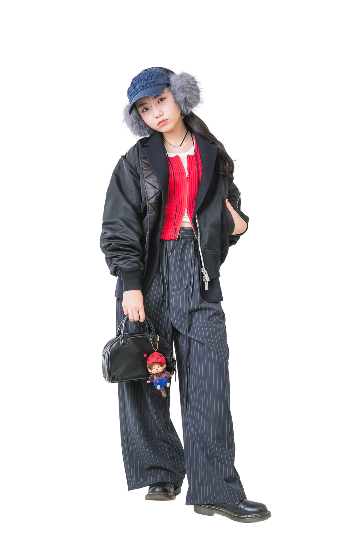 アウターを脱いでもカワイイのがクルミのこだわり。赤トップスでトレンドおさえつつ、きれいめ要素とストリート要素をハイブリッド!キャップにイヤマフONで、ワンランク上のコーデにアプデ。