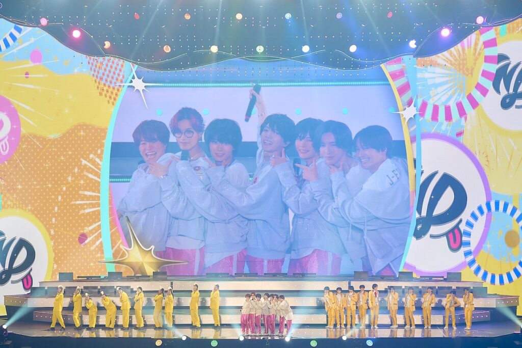 『なにわ男子やねん!』ではアリーナ外周にある7つの浮き島ステージが上がり、側面にメンバー同士で考案したキャッチフレーズが書かれた垂れ幕がお目見えする演出も。西畑大吾くんは「堺・貯金・カレー Uh~~~サンバ!」、大橋和也くんは「リーダー」などワードチョイスにも注目が集まった。