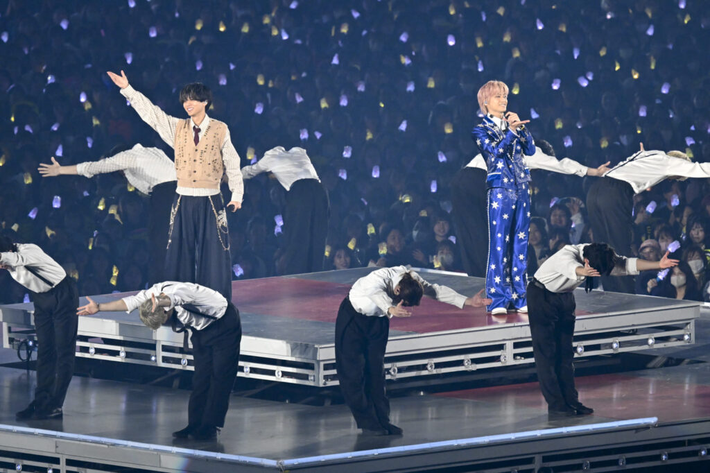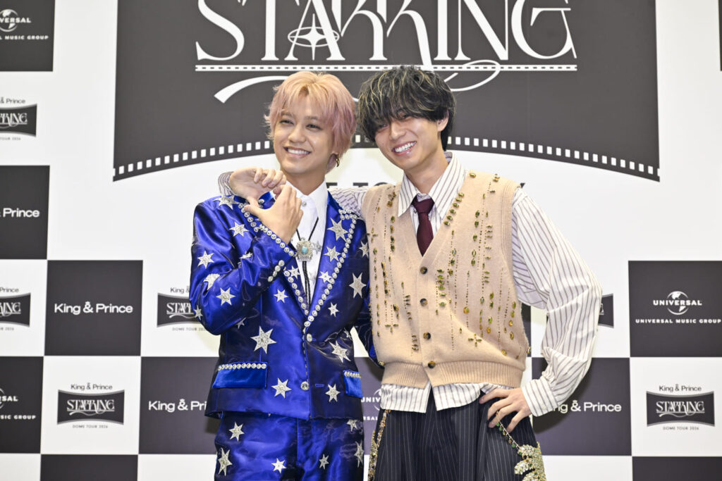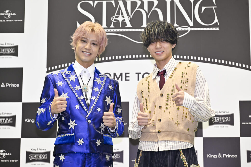 永瀬「昨年は3大ドームツアーをやらせていただいて、今年は4大ということで海人とも話をして、前回とはまた違ったドームの使い方だったり、King & Princeとしてのライブの演出も去年とは全く違ったものになればいいなと思いながら。『STARRING』というアルバムで一緒に頑張って、いろいろ選ばせてもらったり、作ってもらったり、話し合って、本当に強い曲たちをバランスよく入れられたなというか。今年も皆さんが楽しんで、そしてわれわれも楽しめるようなライブになったなと思っております。本当にずっとワクワクしてますね、ライブ期間中は。皆さんと一緒にそのワクワクをともに爆発させられて、熱狂的なライブになればいいなと思います。寒いんで……吹き飛ばすようなね」