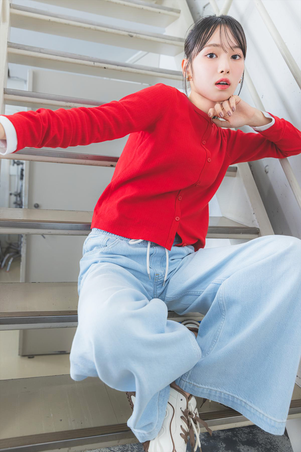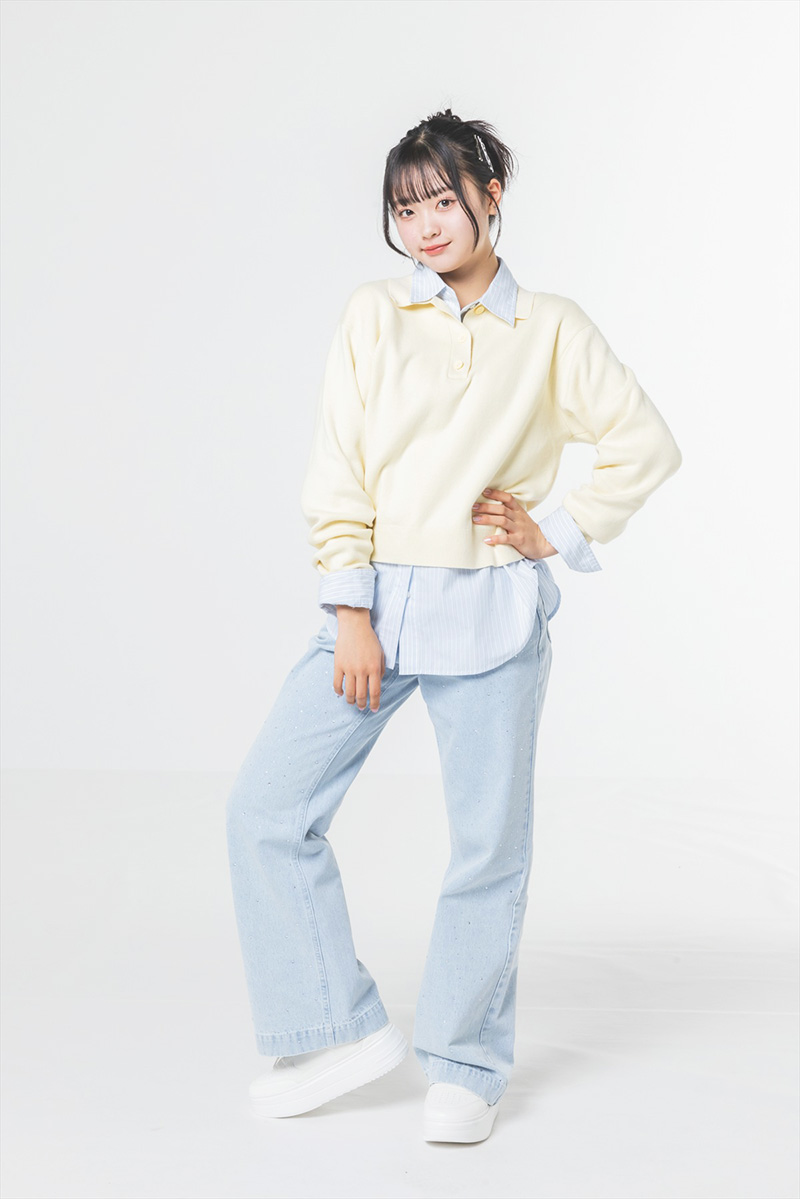 ヒナノ★カーディガン¥1990/ユニクロ 中に着たロングTシャツ※オンライン限定¥3990、デニムパンツ¥9900/ともにGap リング(5本セット)¥2310/OSEWAYA イヤリング¥550/パリスキッズ 原宿本店 スニーカー¥4290/ギャレッツ 渋谷109店