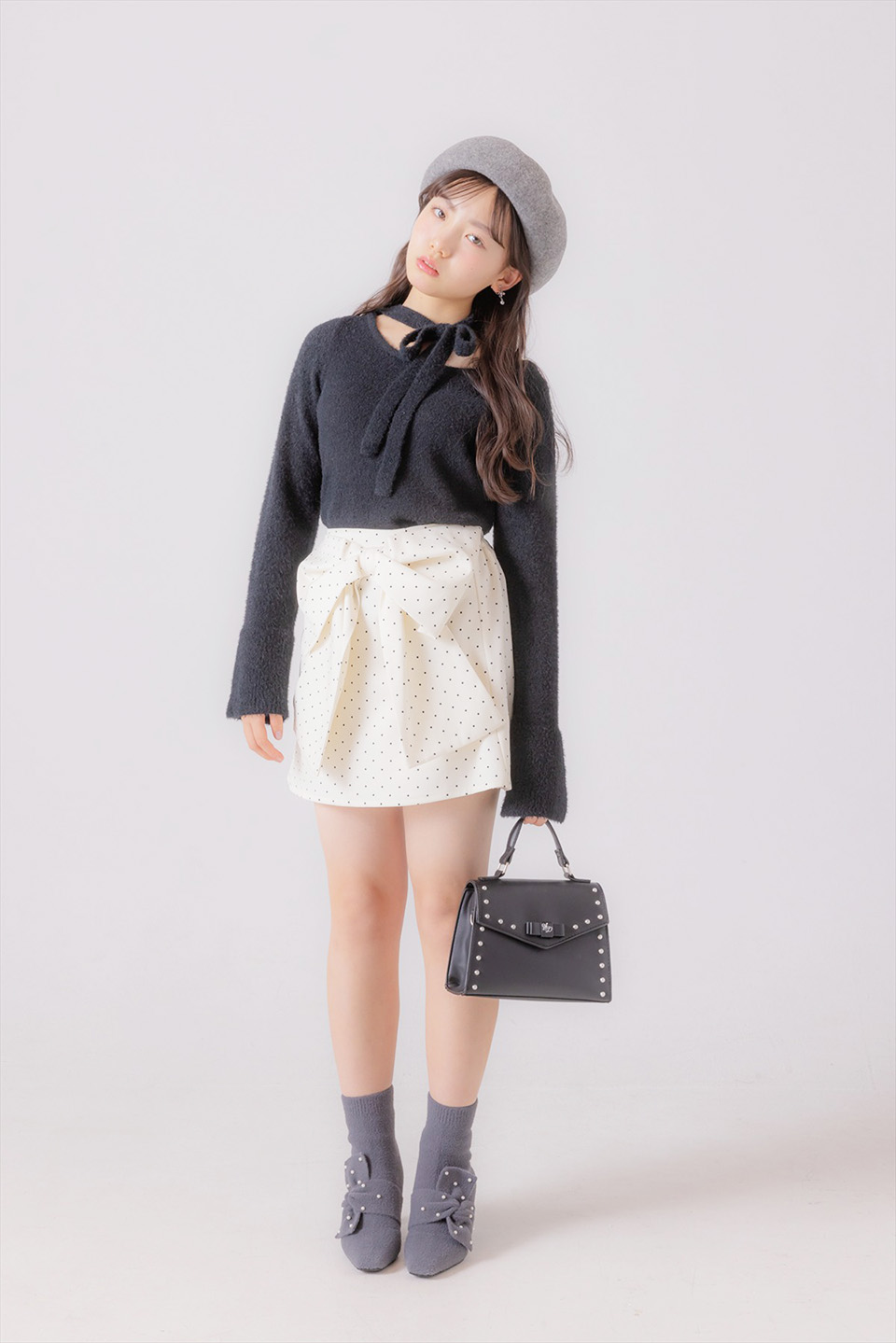 ソノマ★ニットトップス¥3299、パールネックレス¥770/ともにWEGO ニットショートパンツ¥3190、レッグウォーマームートン風ブーツ¥4950/ともにems excite リボンクリップ(2本セット)¥660、イヤリング¥550/ともにパリスキッズ 原宿本店 バッグ¥7920/ギャレッツ 渋谷109店