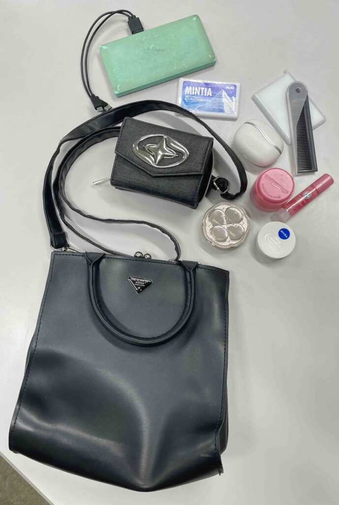 荷物は必要最低限!ポーチには入れず、取り出しやすさを優先するのがハナ流!