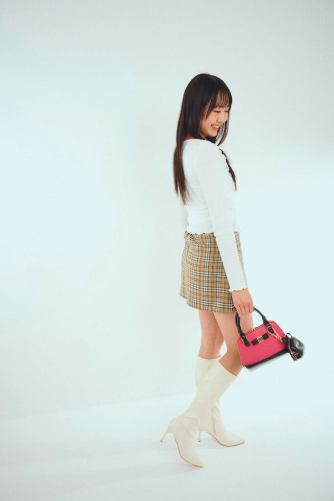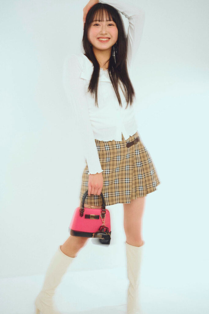 ヒマリ☆レイヤード風ロンT¥3289/SPINNS スカート¥6490/one way イヤリング¥550/パリスキッズ 原宿本店 バッグ¥9350/ギャレッツ 渋谷109店 ロングブーツ¥4510/高速ターミナル 原宿店