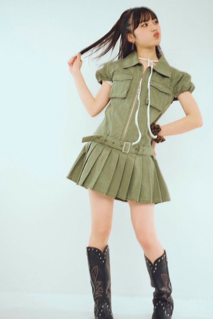 ヒヨリ☆ワンピース¥11000/jouetie Tシャツ¥1399/グレイル イヤリング¥550、シュシュ¥550/ともにパリスキッズ 原宿本店 ブーツ¥8789/SPINNS