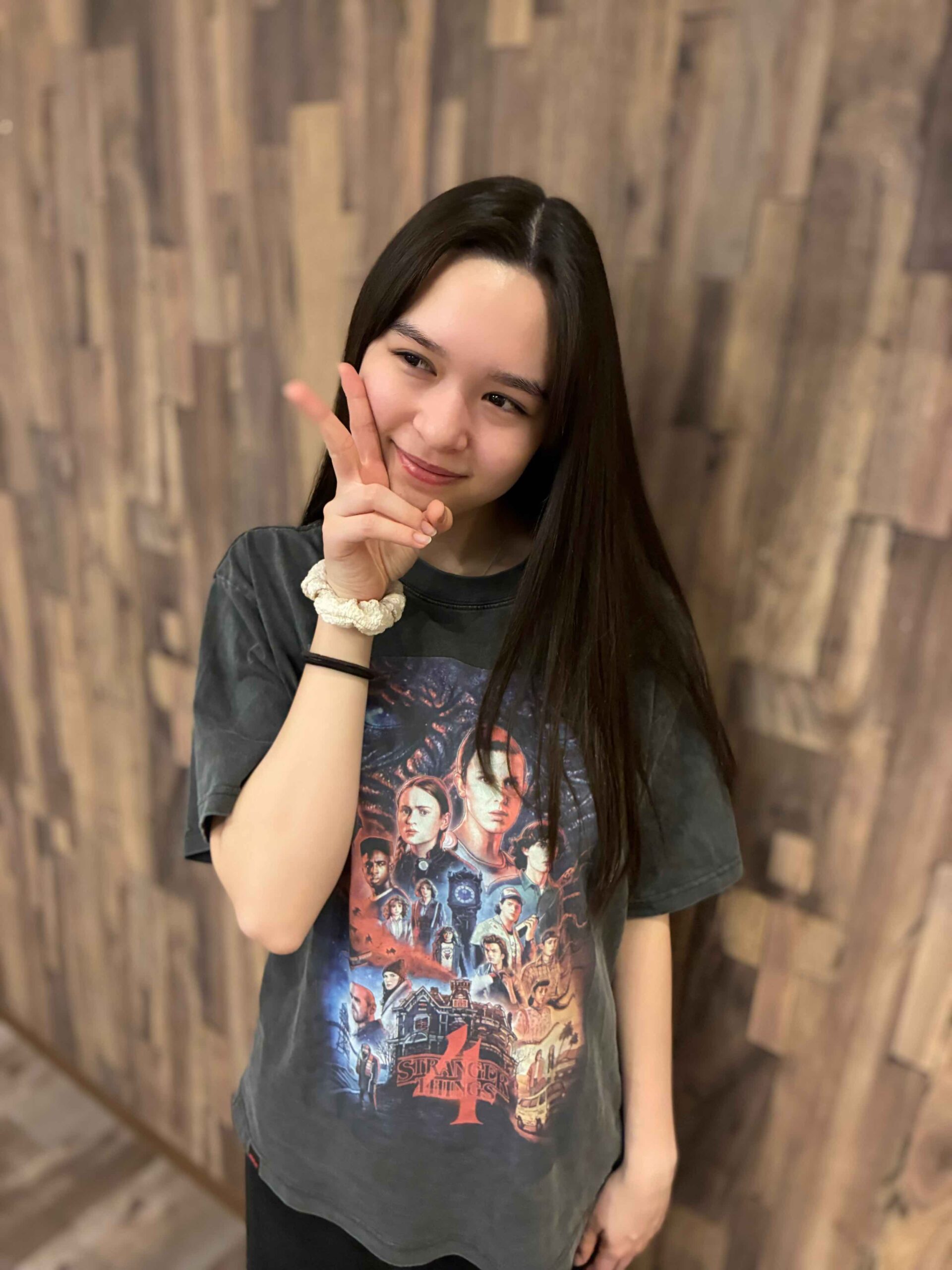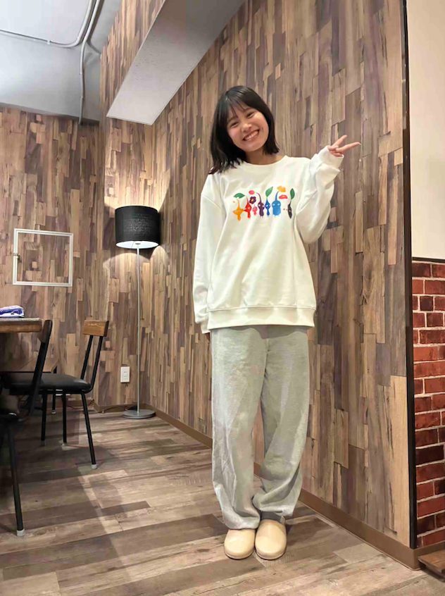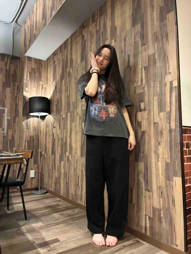 「ストレンジャー・シングスはシーズン4がいっちばん好きだから、このプリントをチョイスしたよ。ちょっと古着っぽい風合いが心地よくて、本当にお気に入り!パンツは話題のUNIQLO:Cのスウェット!シルエットがキレイ♡パジャマは長袖だと寝ているときにちょっと暑くなっちゃうから、基本は一年中半袖で過ごしてるよー!」