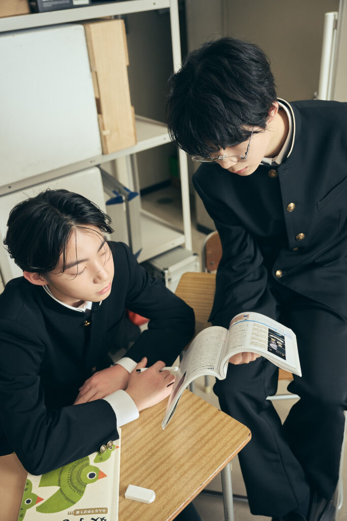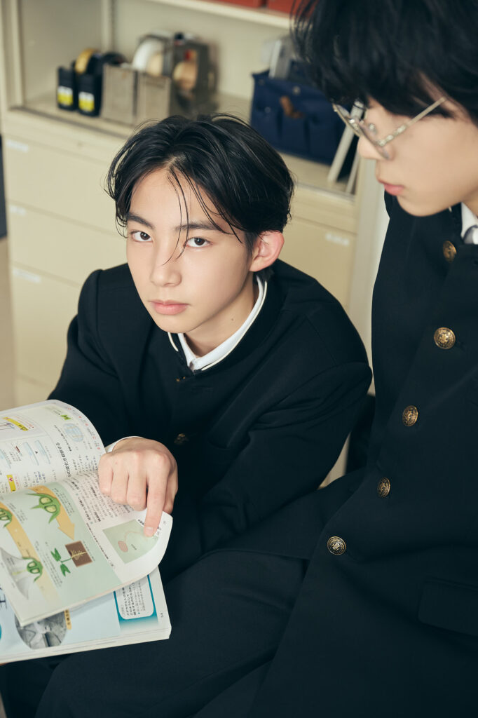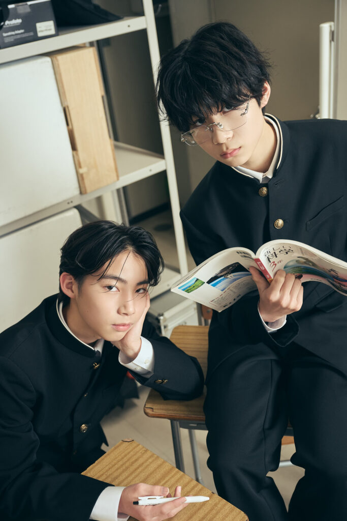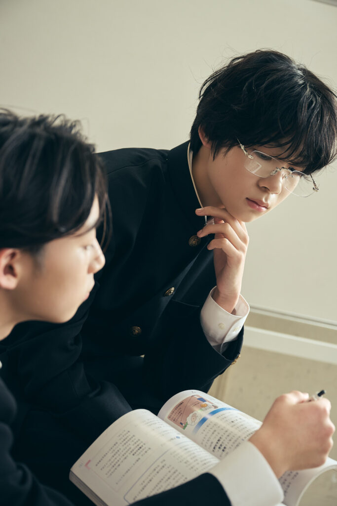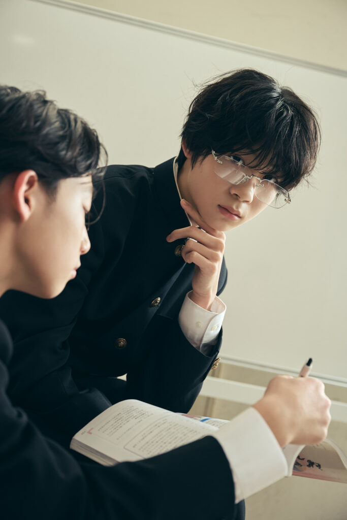 かっちりとした学ランがふたりと化学反応を起こしすぎ!学ランで個性を出すなら、ヘアまでこだわりを見せるのがお約束。AOIはあえてのかきあげスタイルで、ちょっとだけ遊び心をプラス。HALは、くしゃっとしたうざバング×リムレスメガネで理系男子になりきり!
