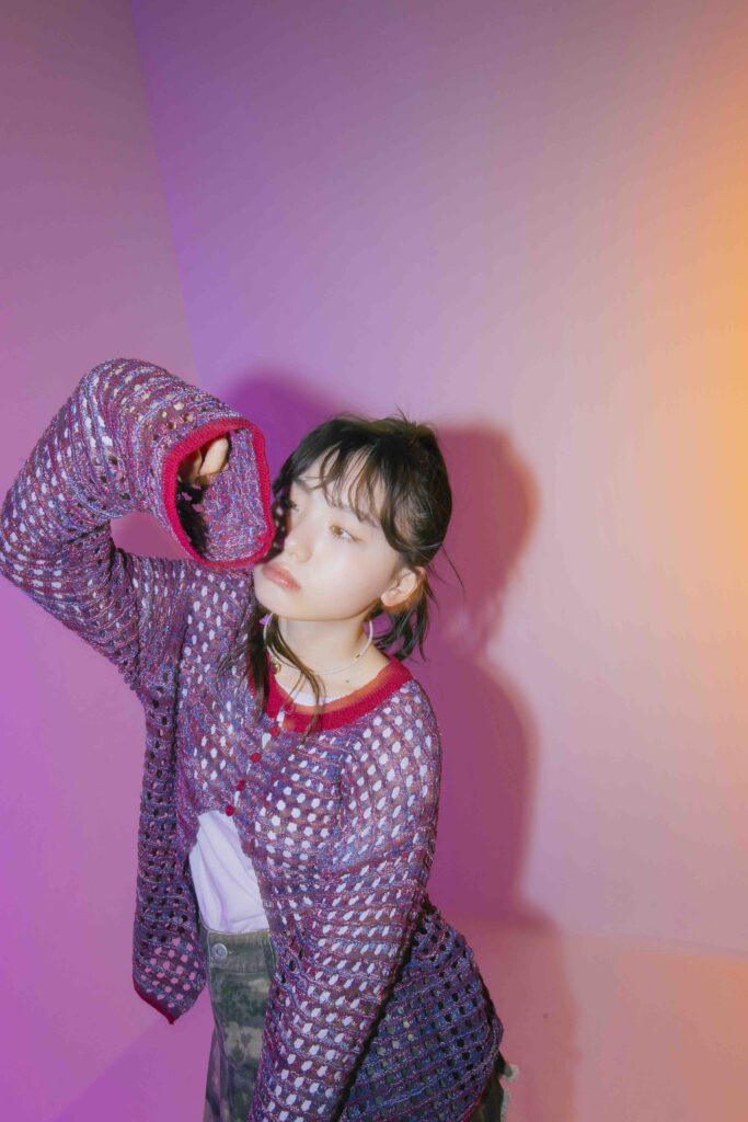 クルミ☆編みトップス¥5940/VACANCY(アンティローザ) ピンクトップス¥1990/ユニクロ スカート¥4990、ヘアクリップセット¥700/ともにレピピアルマリオ チョーカー¥590/GU クリアリング¥1650、パールリング¥1320/ともにOSEWAYA(お世話や)