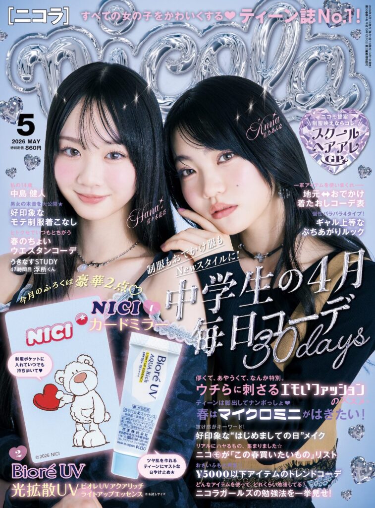 ハナとアンナが「メロい女」をテーマに、いつもとは違う大人なムードのコーデで今月号の表紙に登場♡さらに、今回表紙を飾る2人に加えて、クルミ(稲垣来泉)、ワカナ(葉山若奈)、リコリリ(崎浜梨瑚、中瀬梨里)に会える、超ゴーカ‼︎発売記念ニコラミーティングを開催するよ!まだまだ応募を受け付けているから、ぜひ参加してね♡