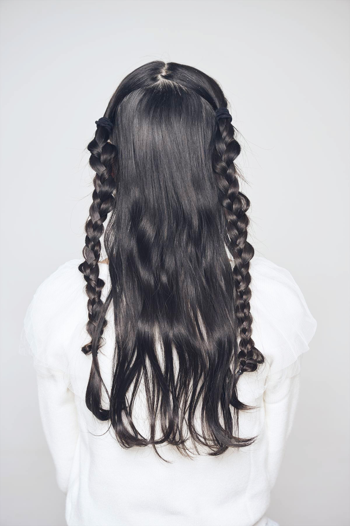 こめかみあたりの毛を5mmくらいの束に分け、そのほかをローポニーにまとめる。