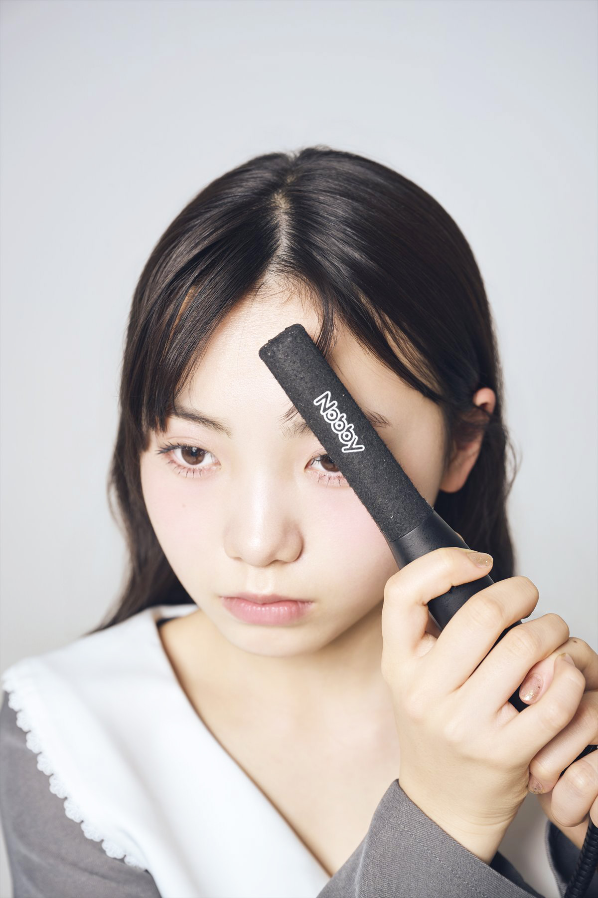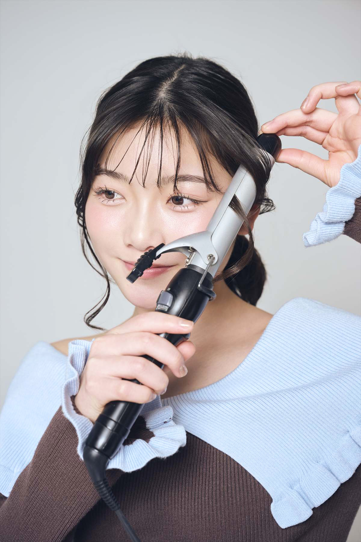 分けたおくれ毛を細めのコテで左右それぞれ外巻きに巻いたら完成!