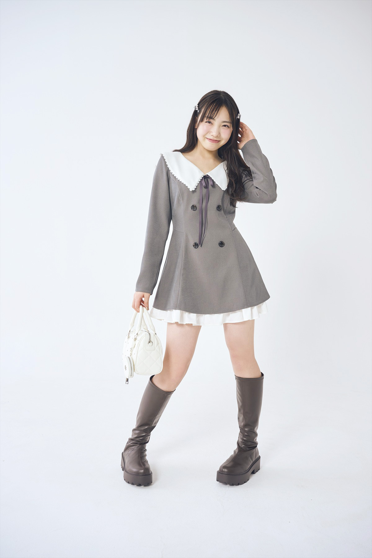 クルミ☆ワンピース¥9020/マジェスティックレゴン(シティーヒル) ヘアピン(2個セット)¥2640/OSEWAYA(お世話や) ポーチつきバッグ¥4399、ブラウンロングブーツ¥6599/ともにWEGO