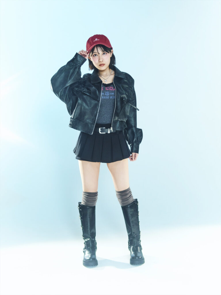 ヒメノ★キャップ¥1650/ギャレッツ渋谷109店 レザー風ジャケット¥13750/SPIRALGIRL ロゴキャミソール¥1499/グレイル ベルトつきスカパン¥3299/Figments 3連ネックレス¥660/ラティス ニーハイソックス¥759/チュチュアンナ エンジニアブーツ¥6929/WEGO