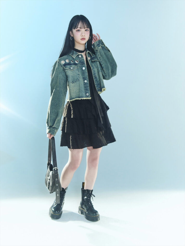 ハナ★ハトメデニムジャケット¥17050、タイつきキャミワンピース¥8690/ともにSPIRALGIRL バッグ¥3299/WEGO ブーツ¥37400/ドクターマーチン イヤリング¥550/パリスキッズ 原宿本店