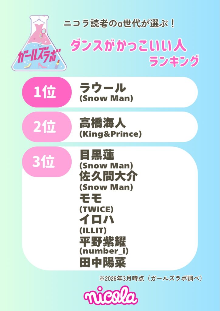 付き合ってほしい人ランキングには、目黒蓮さんに続きM!LKの佐野勇斗さんが2位に!そして、ダンスがかっこいい人にはSnowManのラウールさんが1位に輝いたよ☆