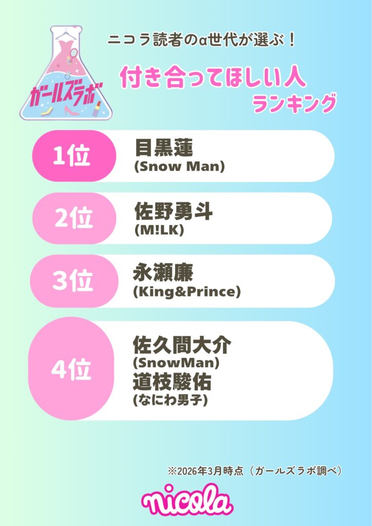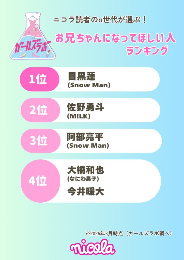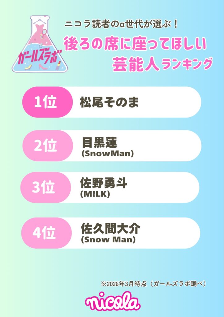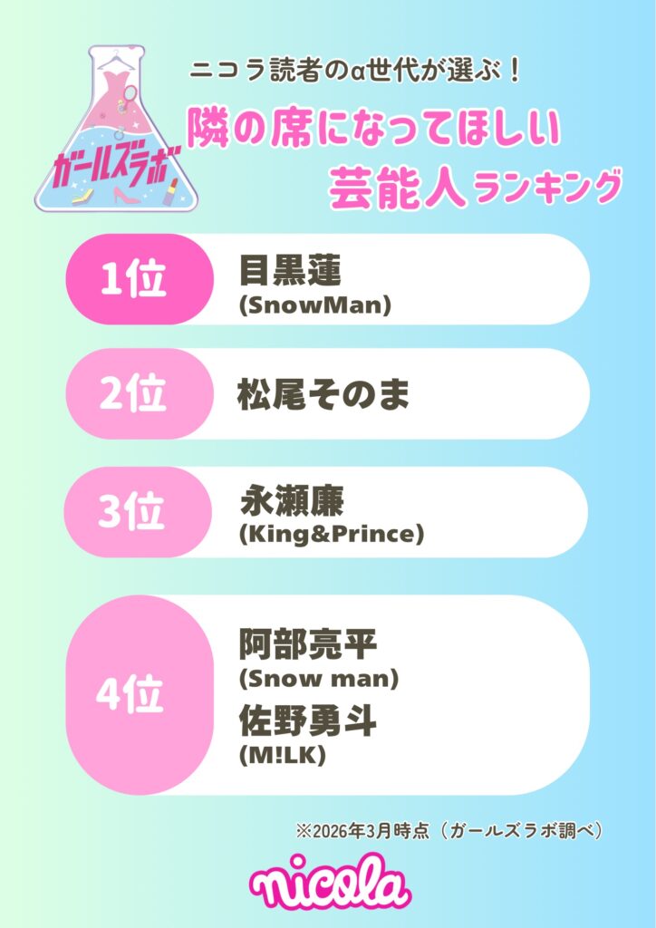 隣の席&後ろの席になってほしい芸能人ランキングには、SnowManの目黒蓮さんが大人気!そして、ニコラモデルの松尾そのまもランクインしたよ!